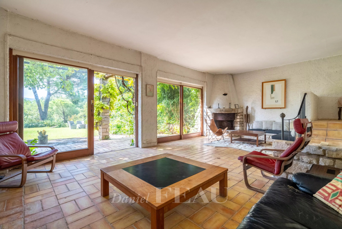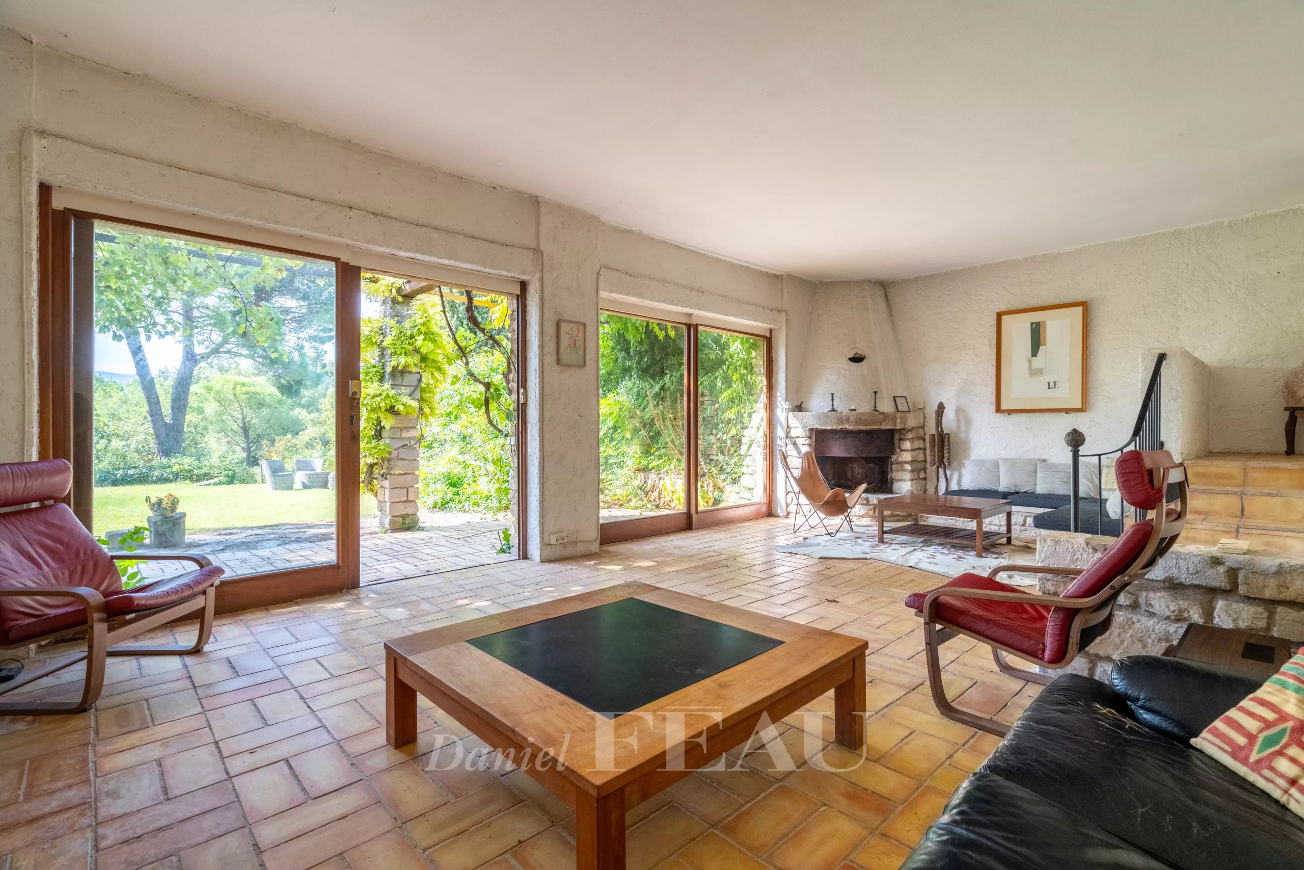 Au rez de chaussée, une cuisine, un salon avec cheminée, un bureau, et une véranda aménagée en jardin d’hiver qui relie la maison à un salon baigné de lumière naturelle avec accès à une belle terrasse avec vue dégagée sur le jardin.