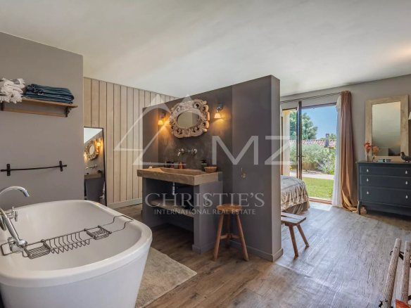 L’entrée s’ouvre sur un vaste hall de 25 m², distribuant les pièces de vie lumineuses. Le salon/salle à manger de 35 m² s’ouvre sur une terrasse exposée sud, idéale pour profiter du climat provençal. La cuisine ouverte, spacieuse et parfaitement équipée, offre 34 m² d’espace convivial, avec un coin repas central et un mobilier de qualité au style authentique. Trois chambres se trouvent de plain-pied, chacune avec sa salle d’eau ou de bains attenante. L’une d’elles dispose d’un accès direct à une terrasse privative, créant un espace intime propice à la détente.