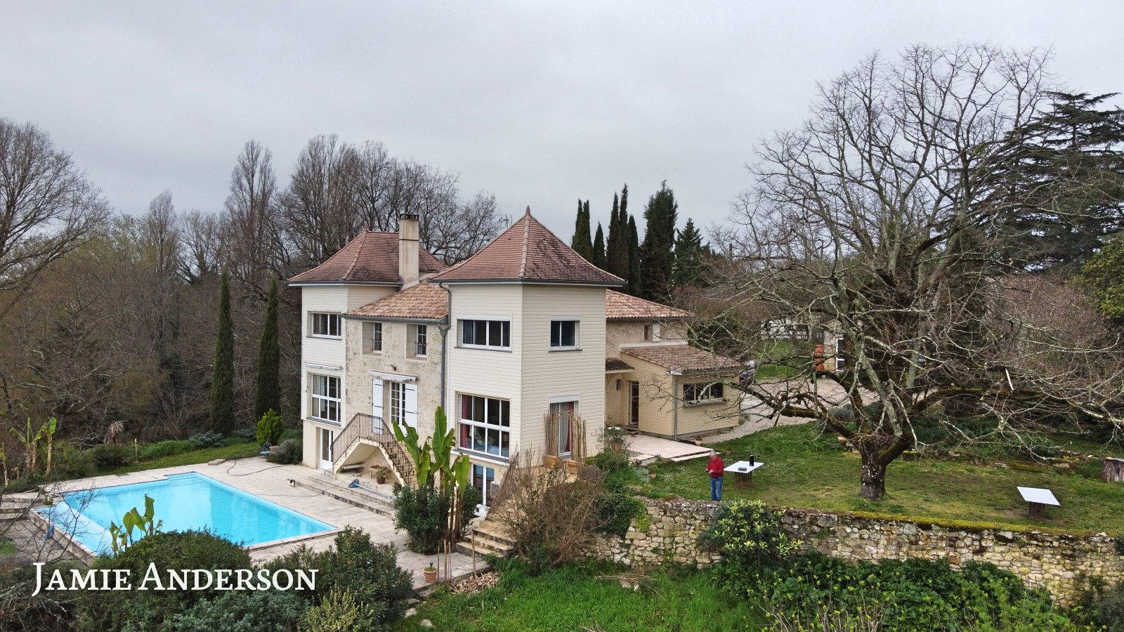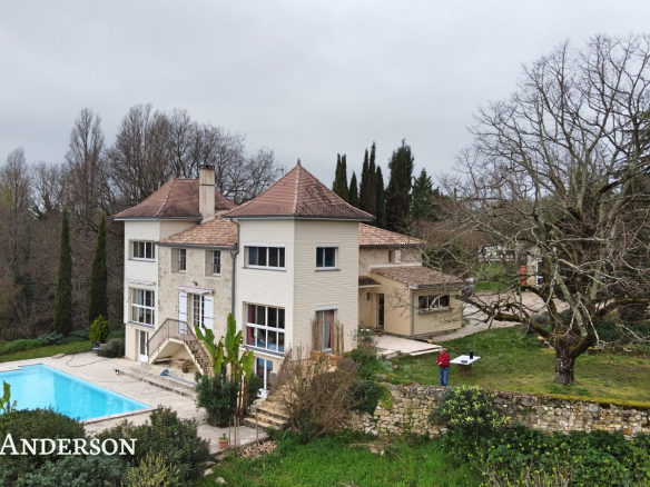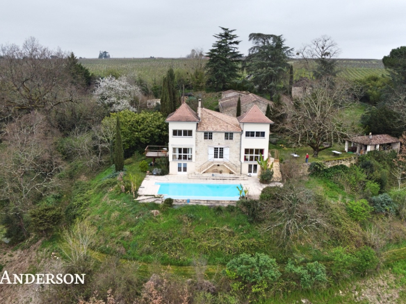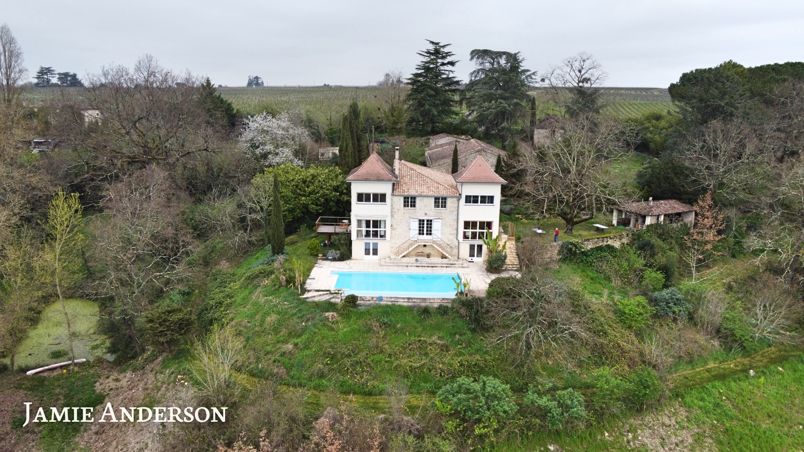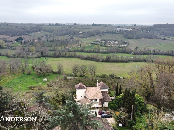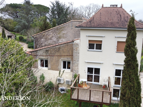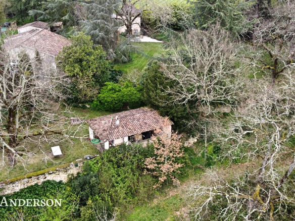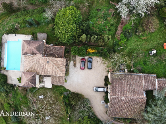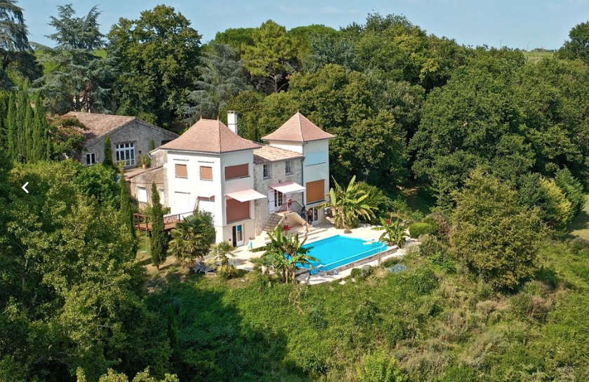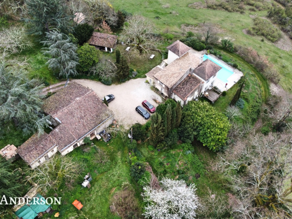 La propriété surplombe la vallée et à l’exterieur vous trouverez une piscine à débordement avec ses belles terrasses, des terrains avec des vergers, deux potagers , des sources et un grand puits.