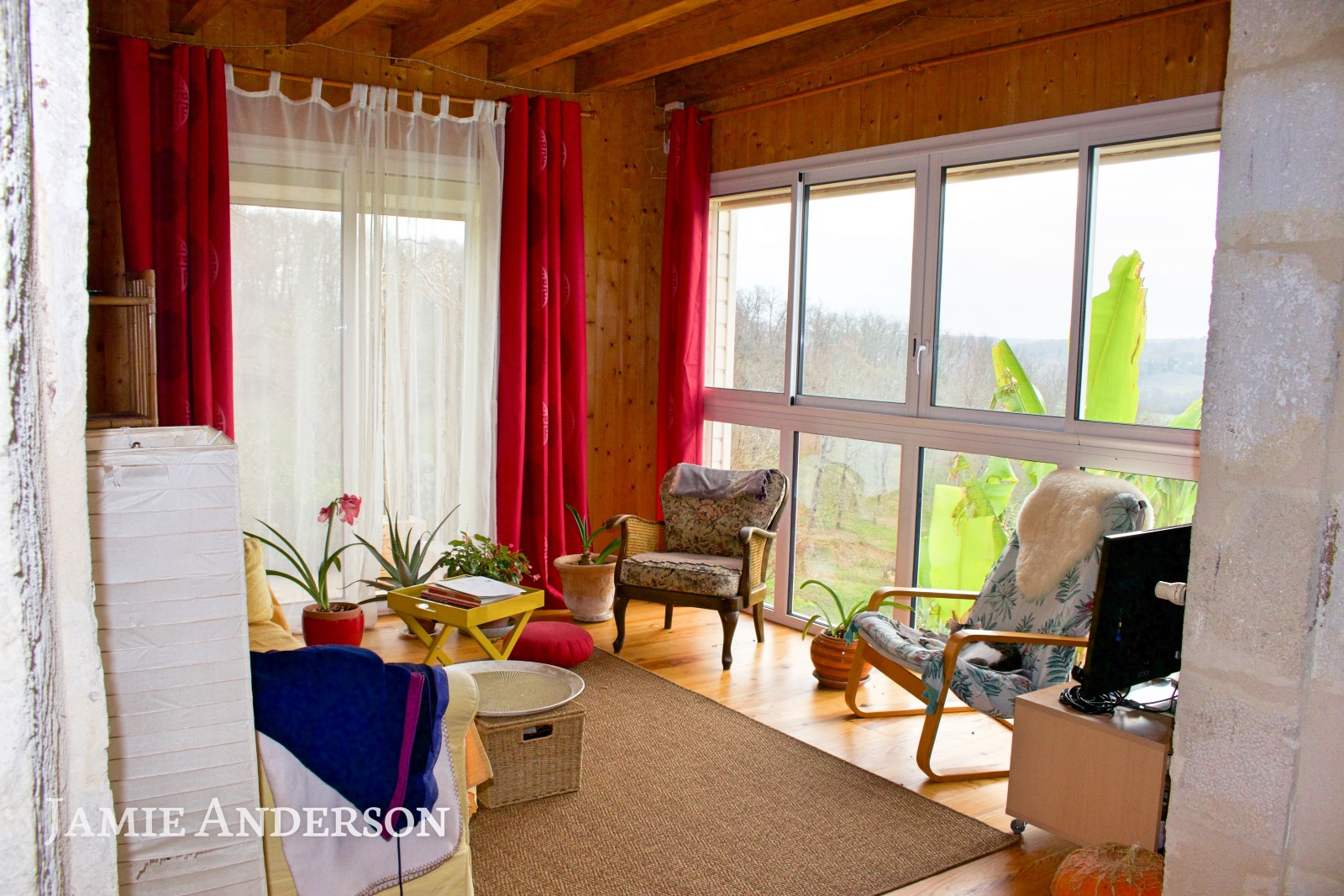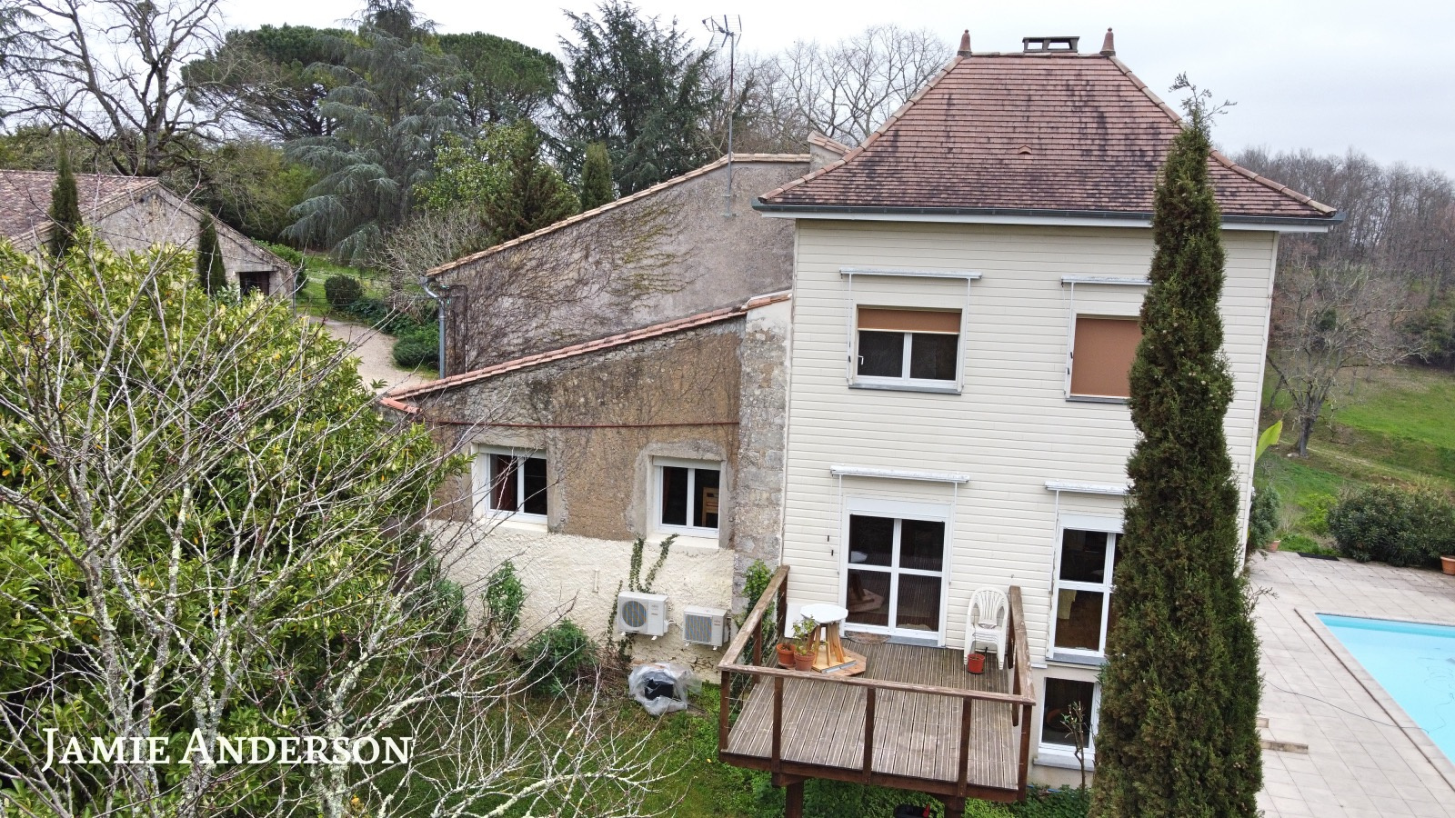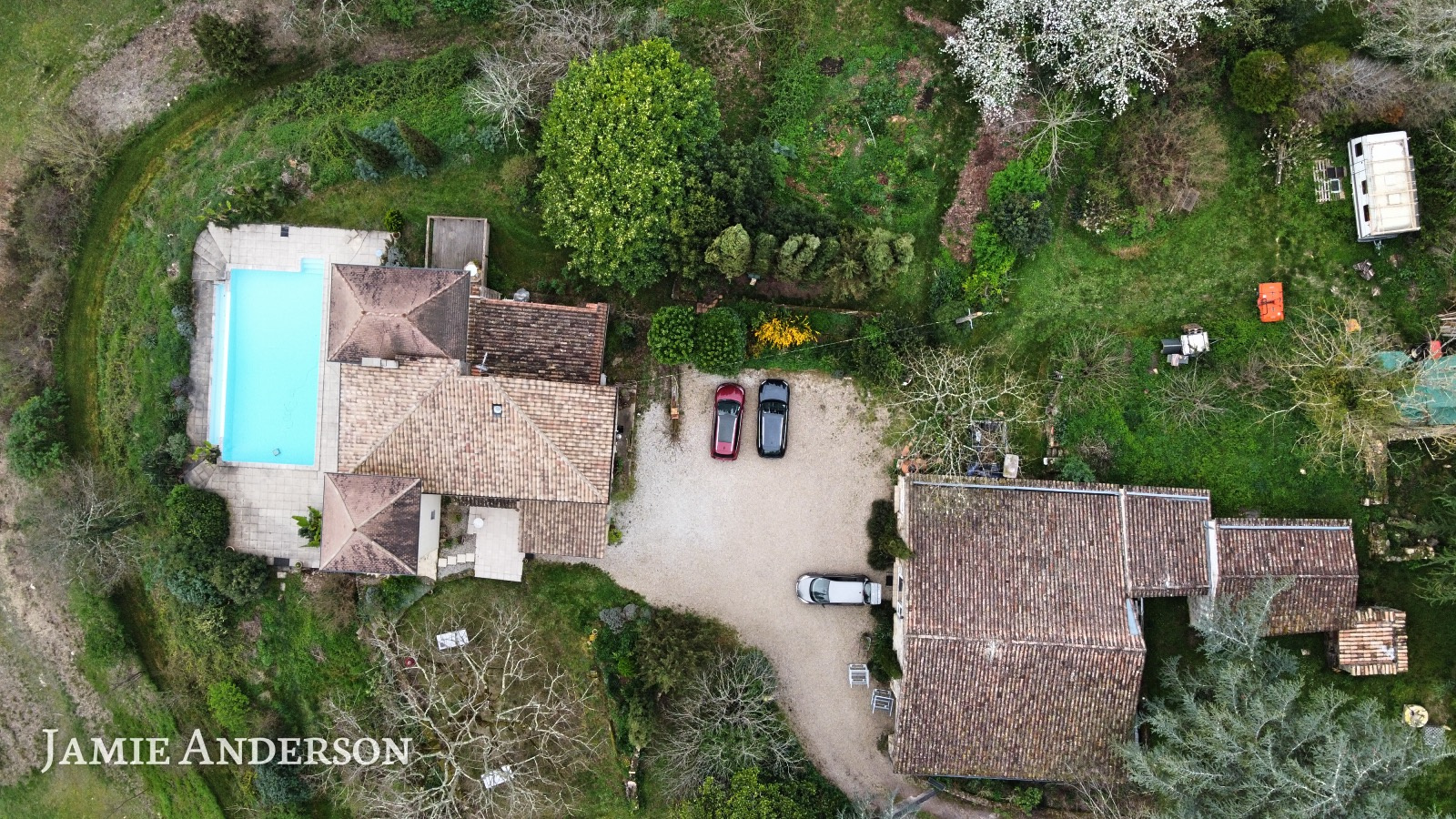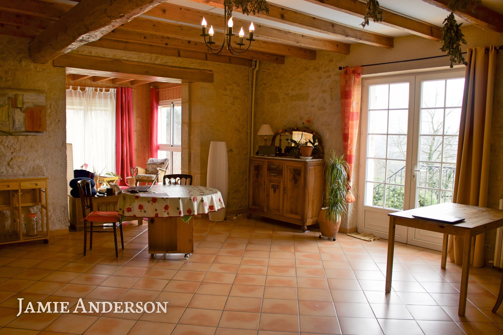 La propriété surplombe la vallée et à l’exterieur vous trouverez une piscine à débordement avec ses belles terrasses, des terrains avec des vergers, deux potagers , des sources et un grand puits.