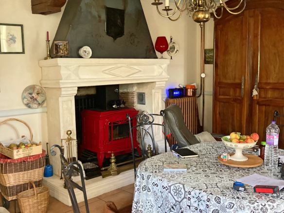 L’entrée traversant de la maison dessert ; une cuisine équipée d’un poêle à bois branché sur les radiateurs et son arrière cuisine, un salon, un bureau, une chambre, une salle de bain et des WC séparés.