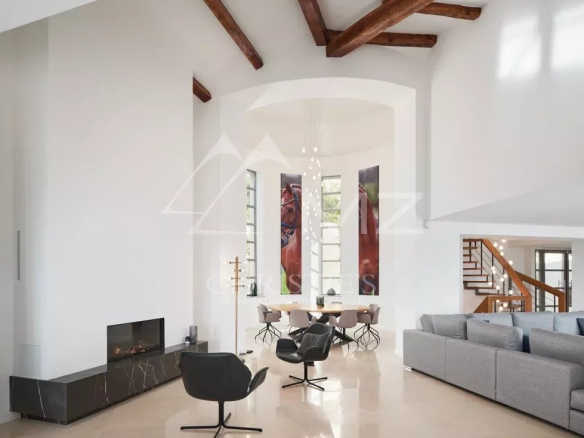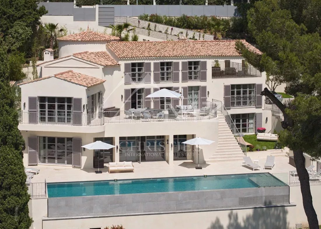 Récemment rénovée à un niveau exceptionnellement élevé, cette belle villa est idéalement située dans l’endroit le plus recherché de Cannes et bénéficie d’une vue imprenable sur le littoral de la Côte d’Azur et sur la mer. Cette propriété accueillante et lumineuse a fait l’objet d’un énorme projet de rénovation au cours des deux dernières années pour devenir cette impressionnante maison, c’est l’endroit idéal pour recevoir amis et famille. Le logement lumineux s’étend sur environ 450 m² et comprend un hall d’entrée, un vestiaire / wc pour les invités, un grand salon / salle à manger avec double hauteur de plafond et une cuisine ouverte sur le salon. Il y a cinq chambres, dont une immense suite parentale au dernier étage avec une grande salle de bains, un dressing et une vaste terrasse couverte avec une vue imprenable, il y a aussi une buanderie et une salle de sport. Le terrain bien entretenu (2 284 m²) comprend une magnifique piscine à débordement flambant neuve et un impressionnant pool house avec cuisine d’été et salon TV, ainsi que de nombreuses places de parking.