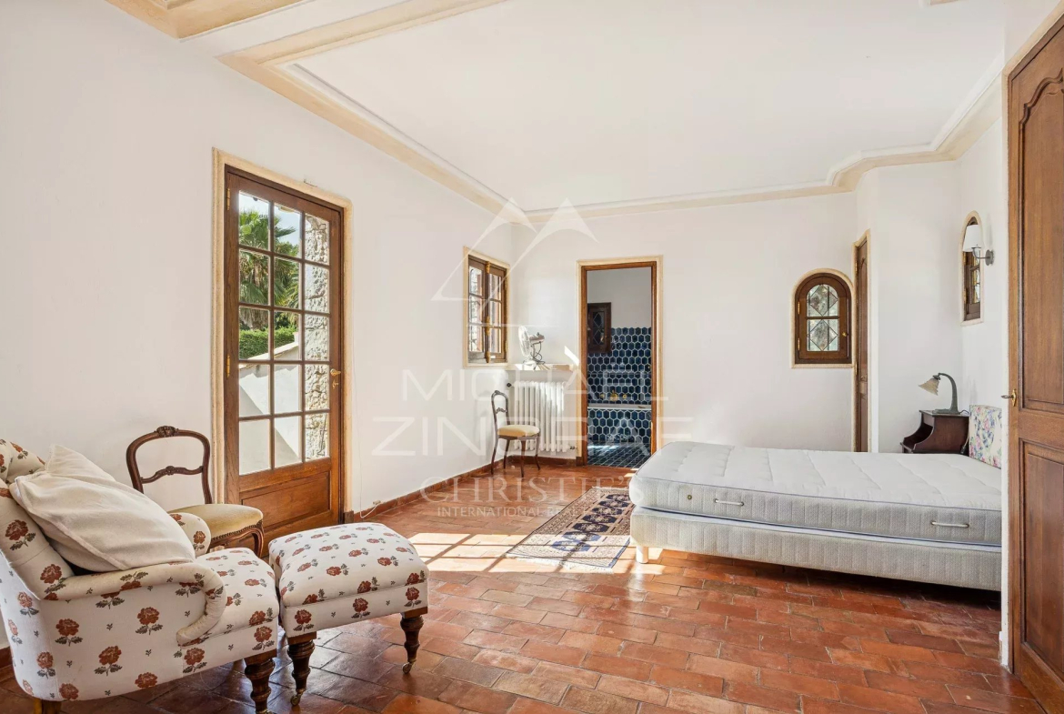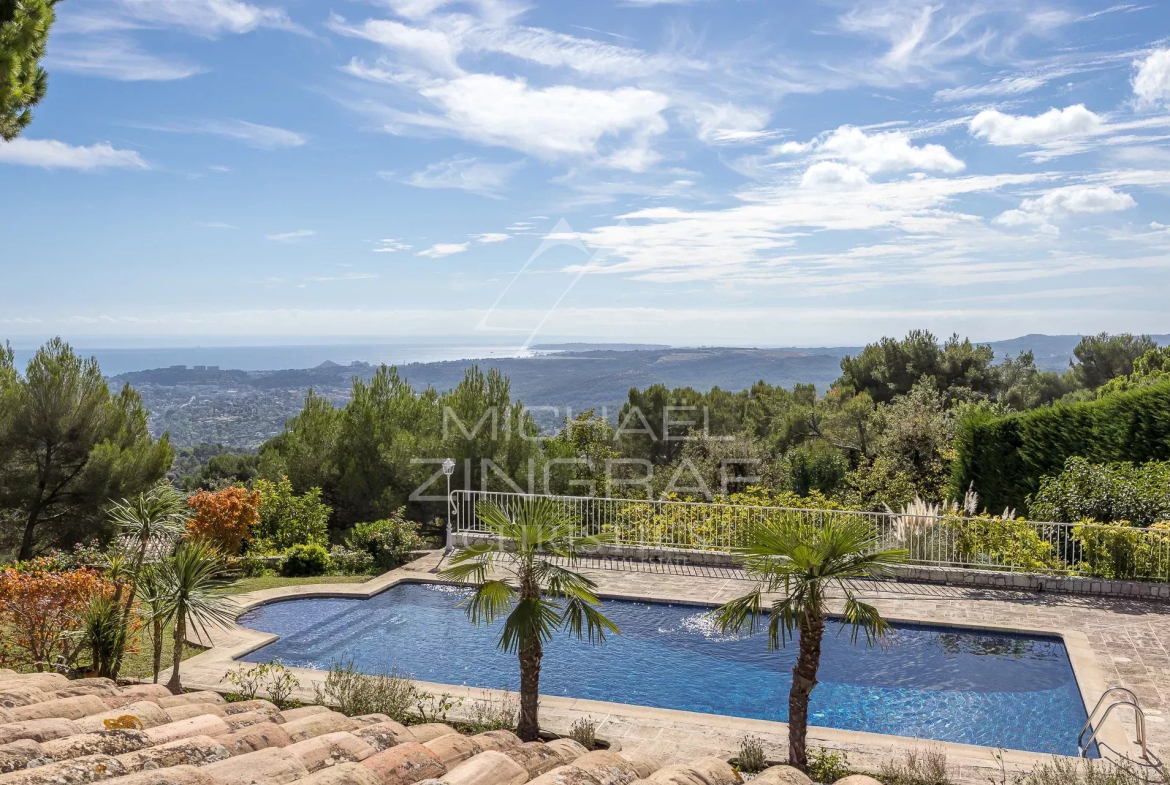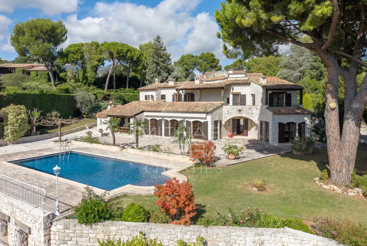 En position dominante et au calme, dans le prestigieux domaine sécurisé des Hauts de Saint-Paul, cette villa avec façade en pierre de style provençal, conçue par un architecte de renom, offre une vue panoramique exceptionnelle sur la mer jusqu’au Cap d’Antibes.
