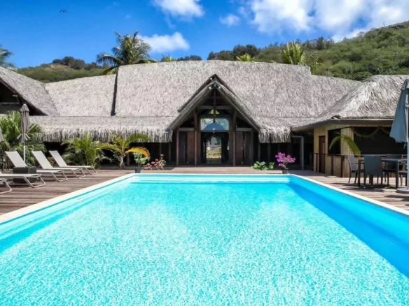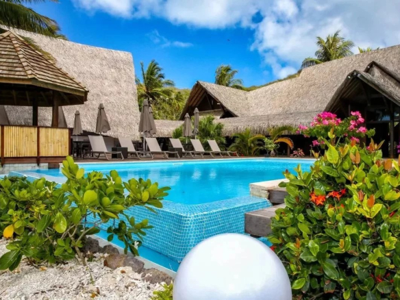 Hôtel de luxe à vendre à Bora Bora, Polynésie française. 80 chambres climatisées, plage privée, restaurant gastronomique, piscine à débordement, jardin tropical polynésien.