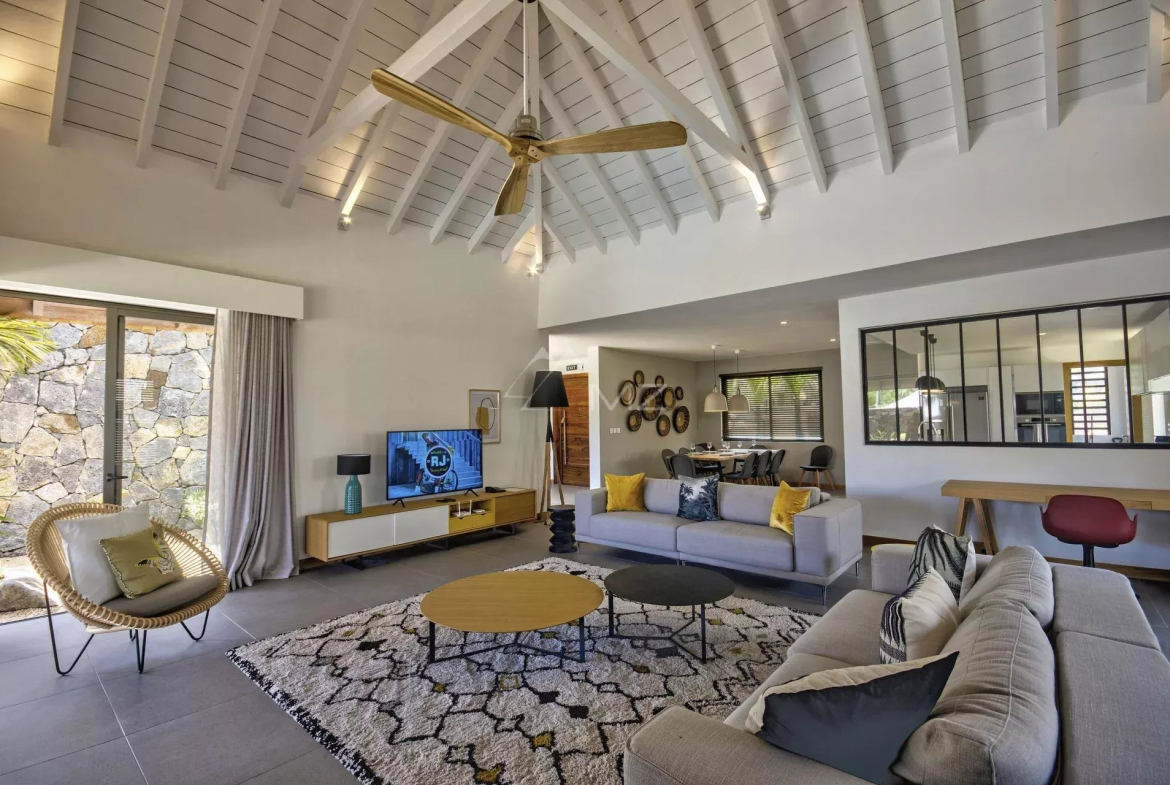 Un très bel espace avec de grands volumes et nombreuses ouvertures sur le jardin et la terrasse couverte.