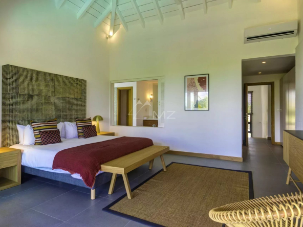 Une chambre ouvrant sur une terrasse couverte privative, et donnant sur le jardin et la piscine.
