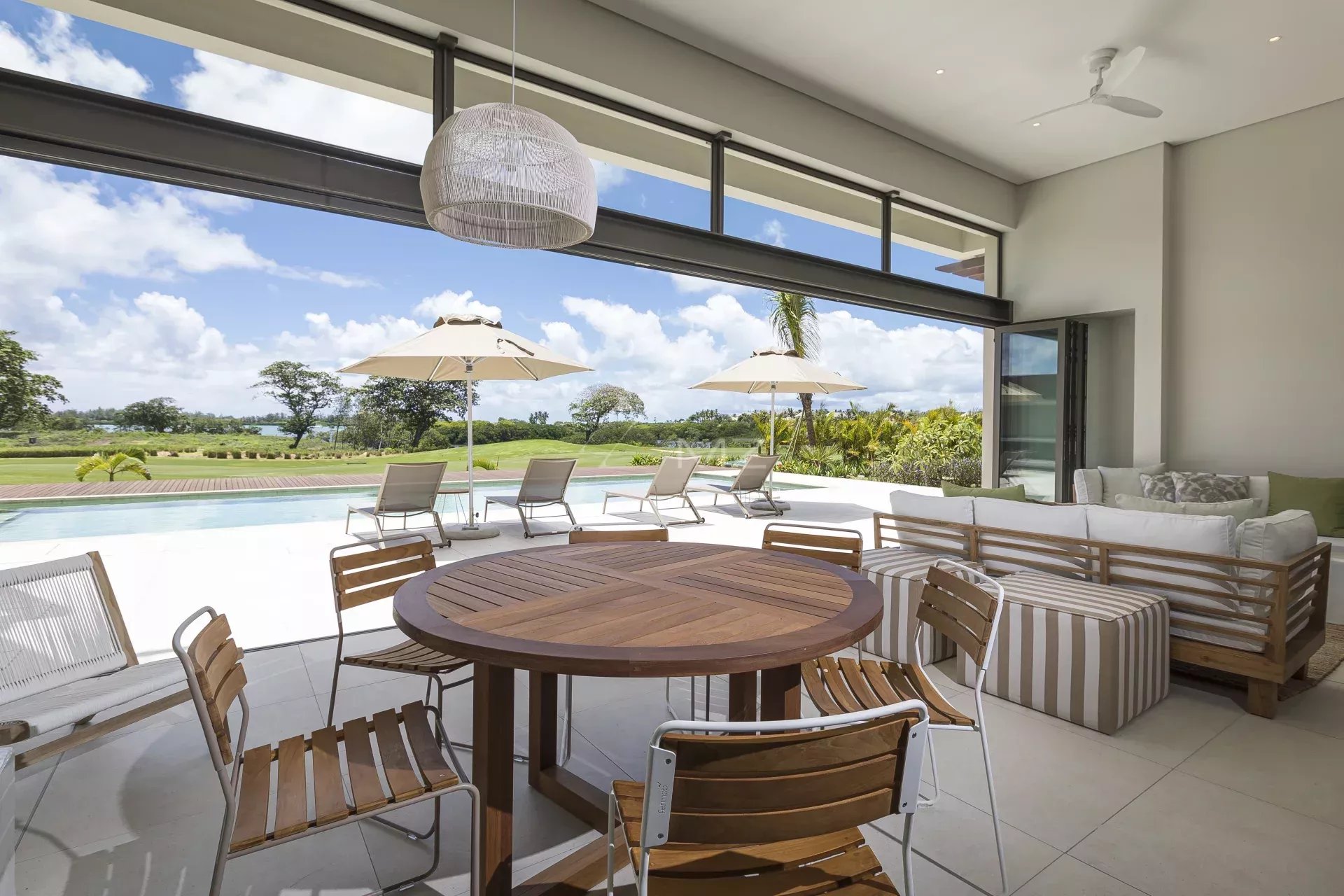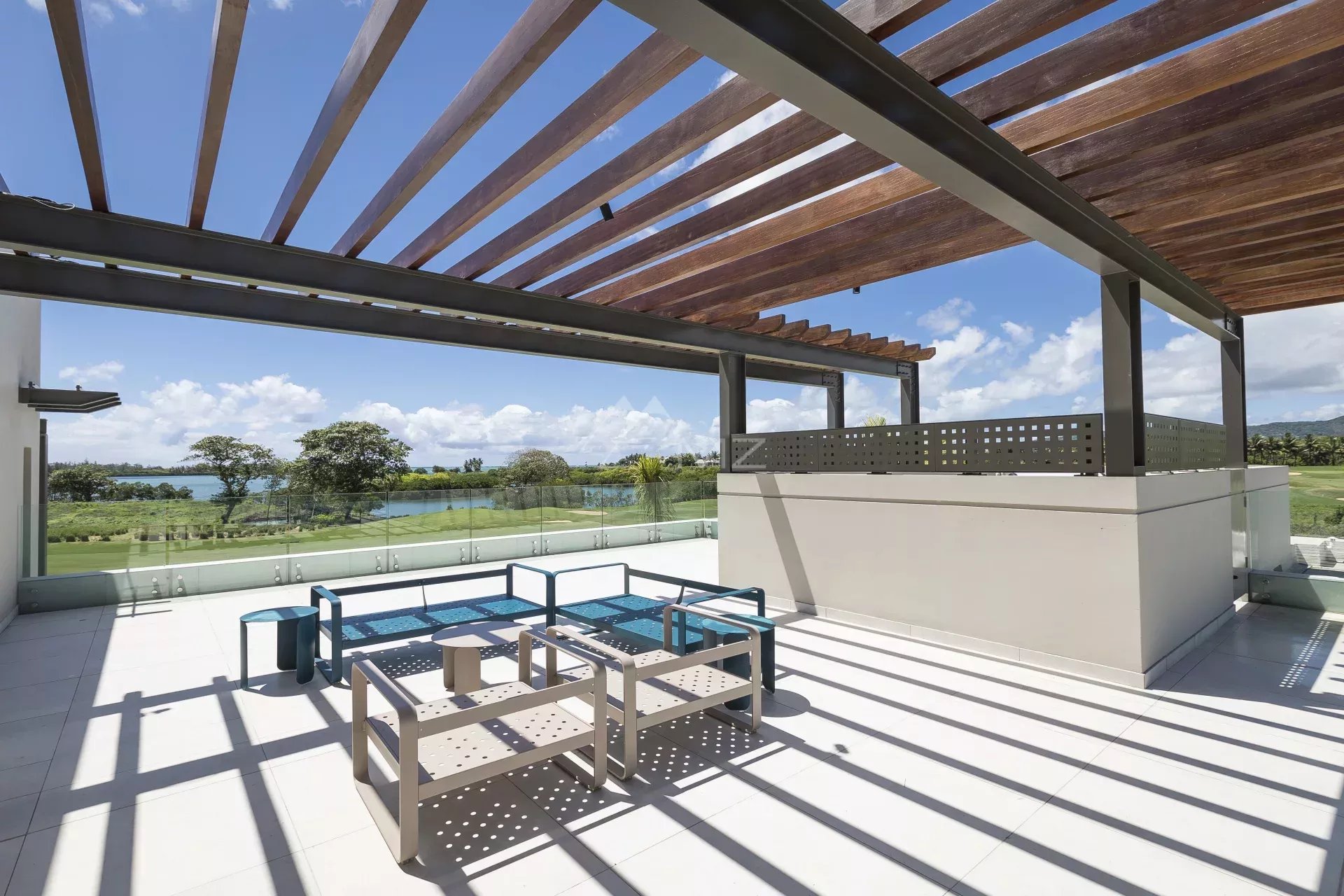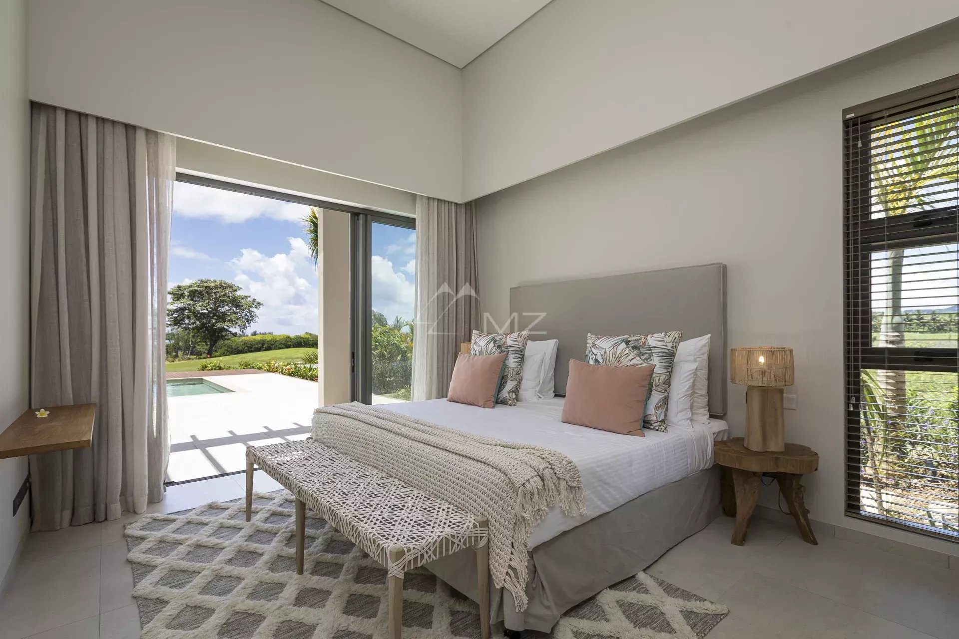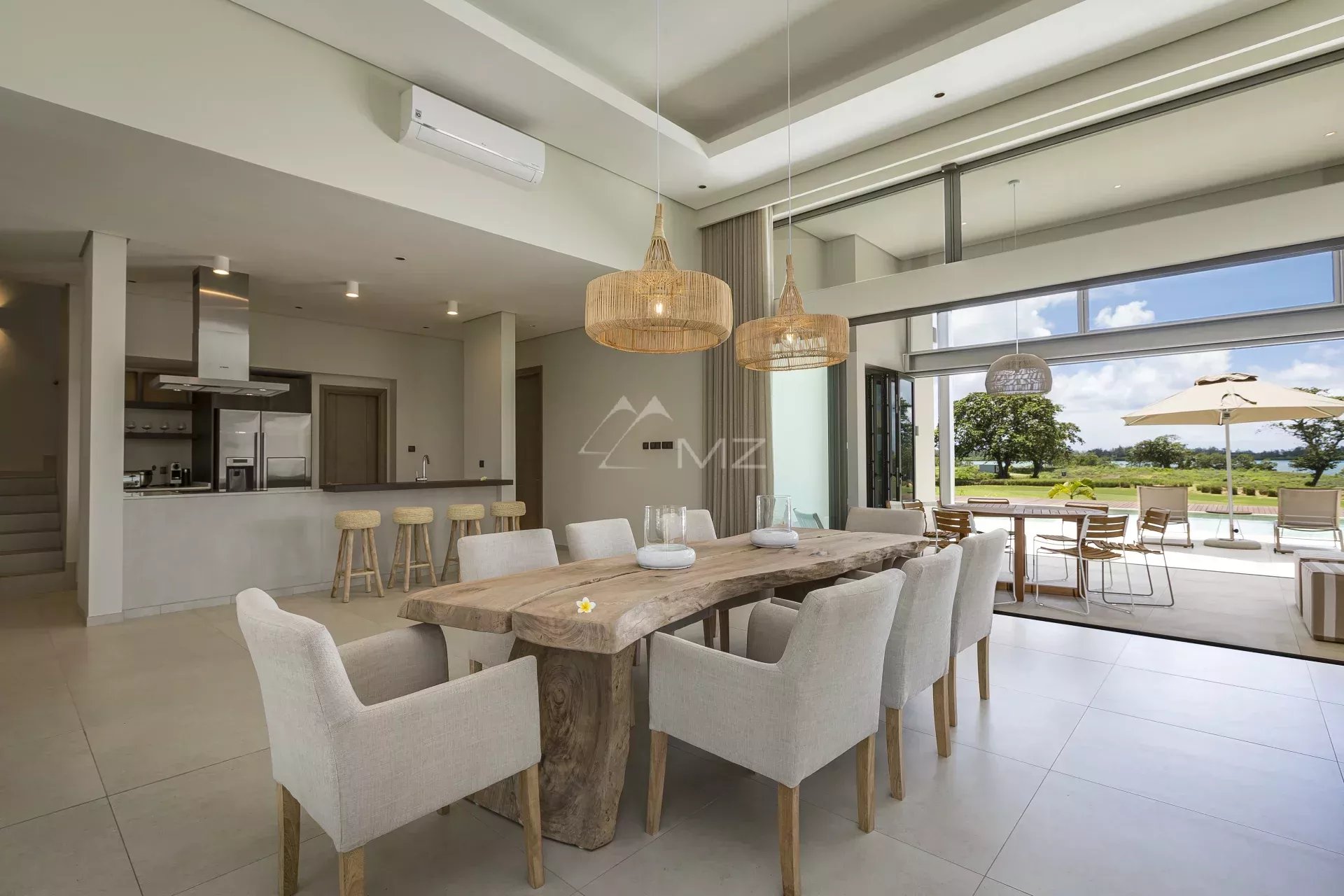 Blotti au cœur du parcours de golf de renommée internationale, ce quartier propose un cadre de vie empreint de sérénité. Votre villa de luxe, sur un terrain en pleine propriété, vous offrira une vue sur les fairways dessinés par la légende Ernie Els et sur la chaîne de montagnes Bambou.Cette villa de 304 m2 très récente possède 4 chambres avec salle de bains en suite. Située au bord du golf, elle offre de magnifiques perspectives sur le parcours et sur le lagon qui lui font face. Construite sur un terrain partagé de 2 243 m2, cette villa jumelée aux hauteurs sous plafond remarquables offre des espaces de vie très lumineux, dont un grand salon-salle à manger avec cuisine américaine qui s’ouvrent sur une belle terrasse et une piscine aux larges dimensions. Elle est également dotée d’un toit-terrasse avec vue panoramique pour partager de superbes moments de convivialité en famille ou entre amis.