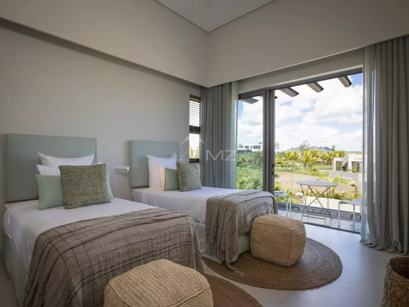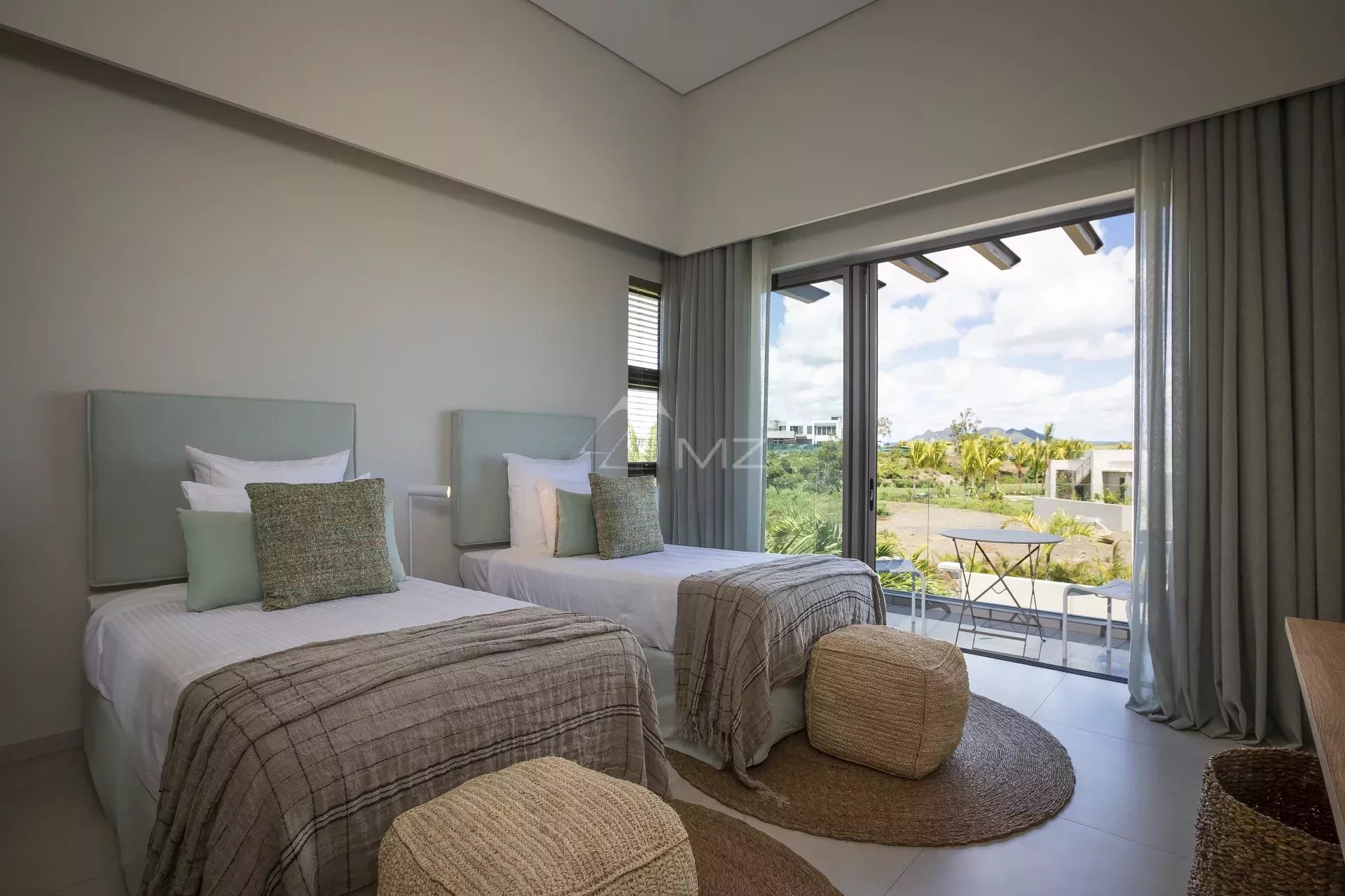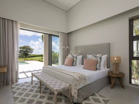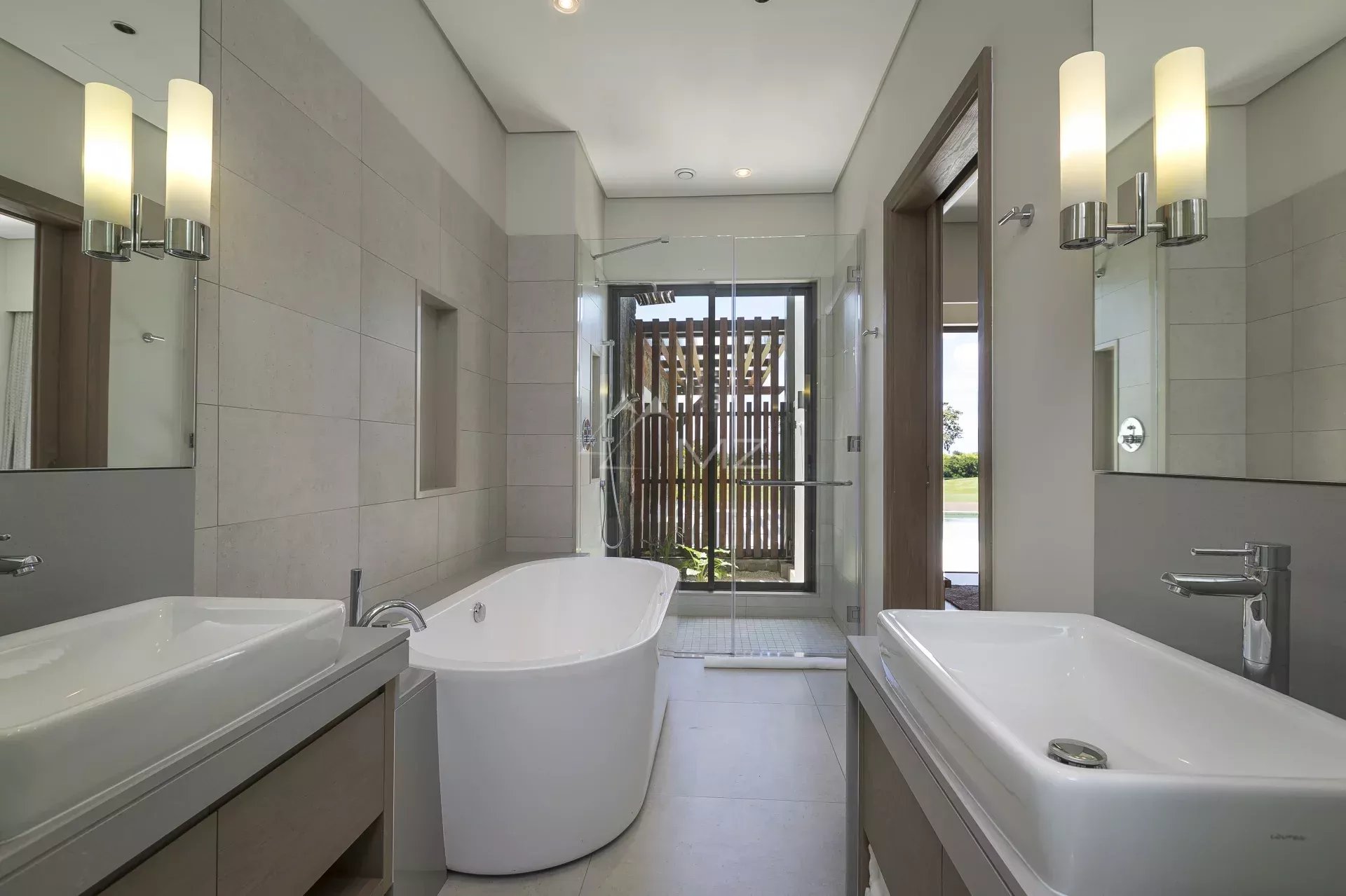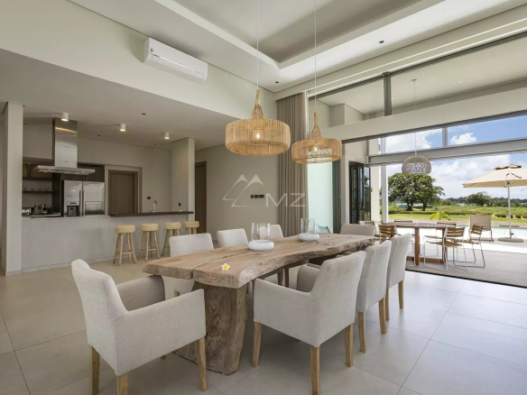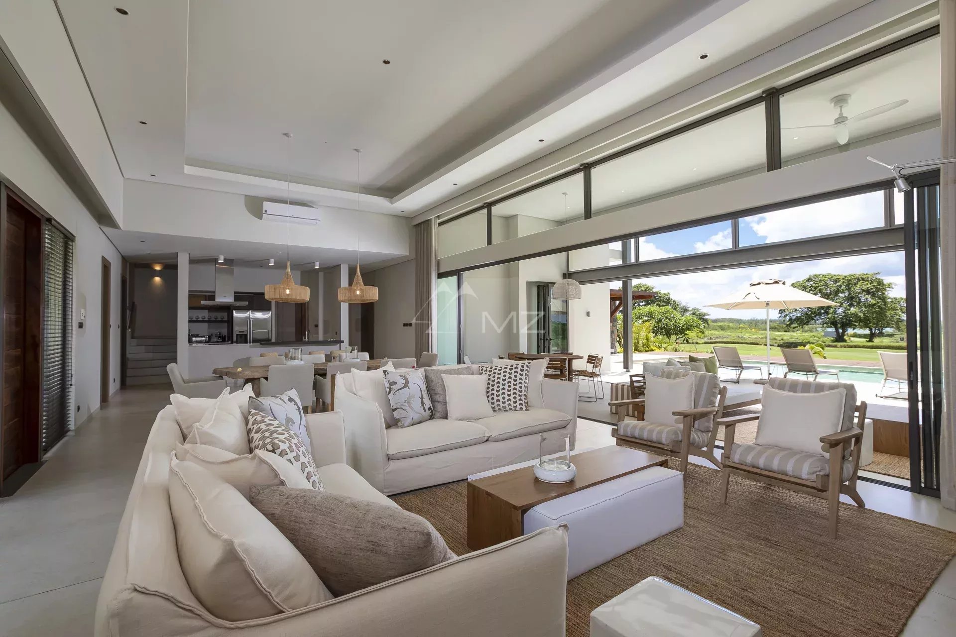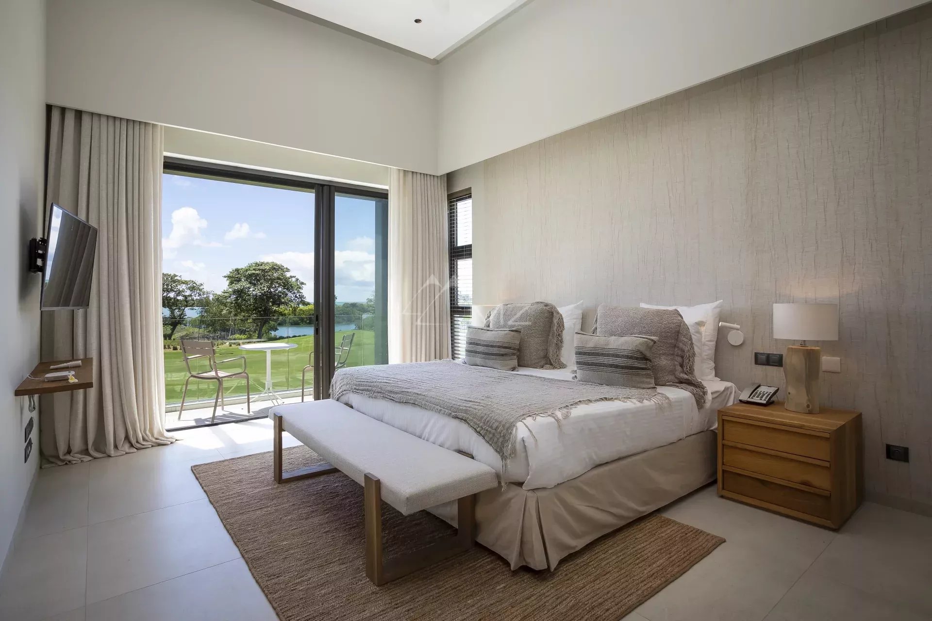 Blotti au cœur du parcours de golf de renommée internationale, ce quartier propose un cadre de vie empreint de sérénité. Votre villa de luxe, sur un terrain en pleine propriété, vous offrira une vue sur les fairways dessinés par la légende Ernie Els et sur la chaîne de montagnes Bambou.Cette villa de 304 m2 très récente possède 4 chambres avec salle de bains en suite. Située au bord du golf, elle offre de magnifiques perspectives sur le parcours et sur le lagon qui lui font face. Construite sur un terrain partagé de 2 243 m2, cette villa jumelée aux hauteurs sous plafond remarquables offre des espaces de vie très lumineux, dont un grand salon-salle à manger avec cuisine américaine qui s’ouvrent sur une belle terrasse et une piscine aux larges dimensions. Elle est également dotée d’un toit-terrasse avec vue panoramique pour partager de superbes moments de convivialité en famille ou entre amis.