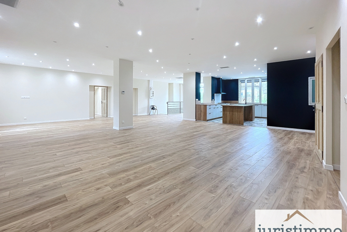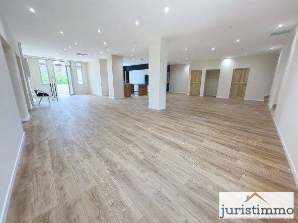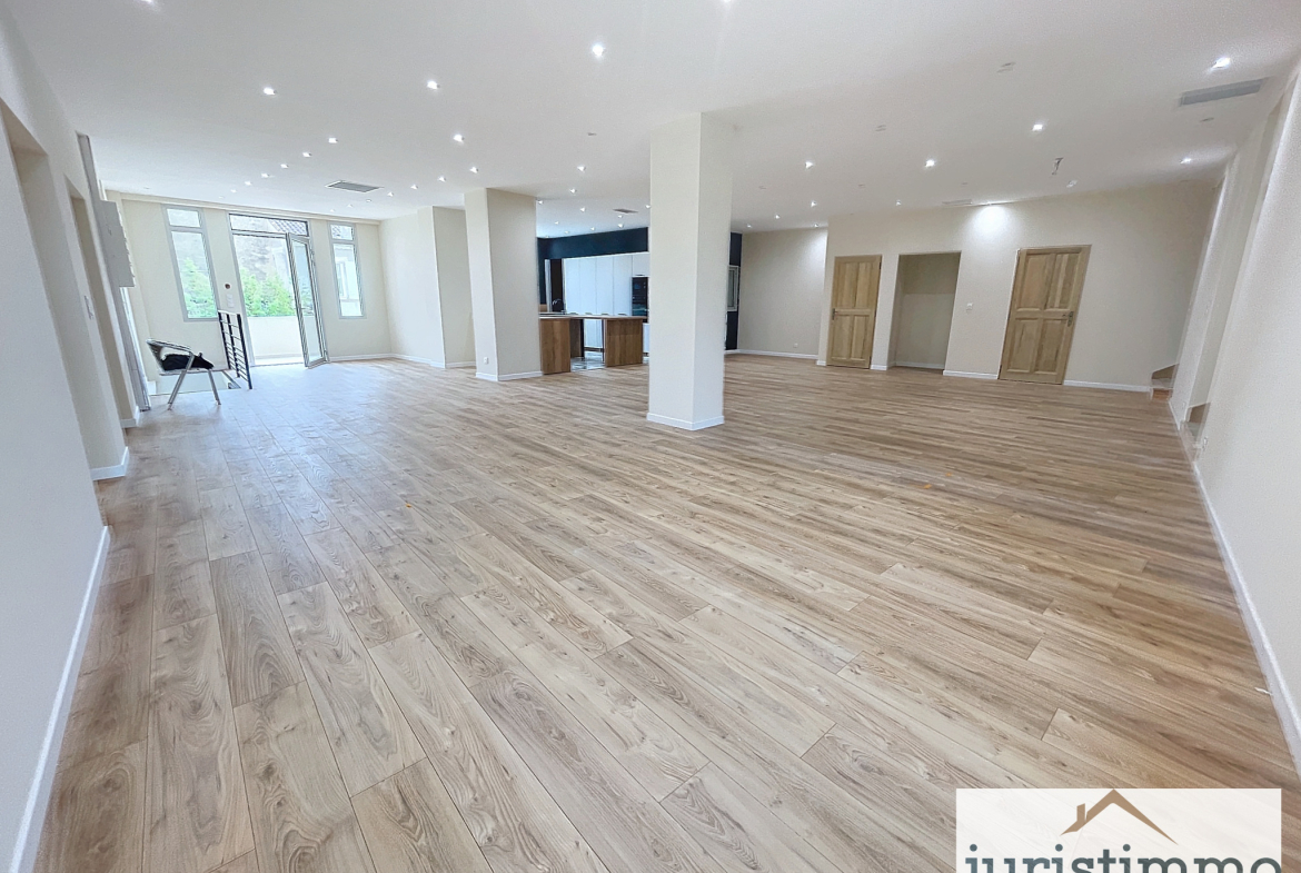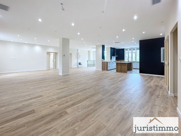 À l’étage, une exceptionnelle pièce de vie lumineuse de 142 m2 avec sa grande cuisine ouverte avec ilot central, marbre au sol, et cellier attenant vous offre l’ambiance d’un loft. Deux suites parentales de 27 et 24,5 m2, chacune avec salle de bain et dressing, ainsi que deux chambres de 14 m2 complètent cet étage.