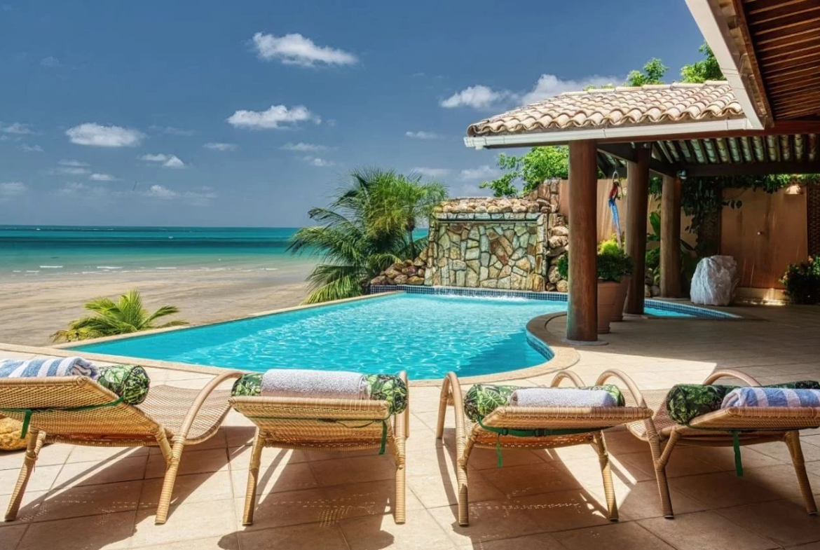 Évadez-vous dans la luxueuse Casa Montebello 5 étoiles, un paradis tropical situé sur la pittoresque côte nord-est du Brésil. Cette superbe maison de vacances à vendre au Brésil (appartenant à une famille néerlandaise/suédoise depuis plus de 20 ans) se trouve directement sur les plages de sable blanc de Porto Mirim et offre une plage privée de 50 mètres de long, entourée de palmiers luxuriants et de l’eau scintillante. eaux turquoise de l’océan.