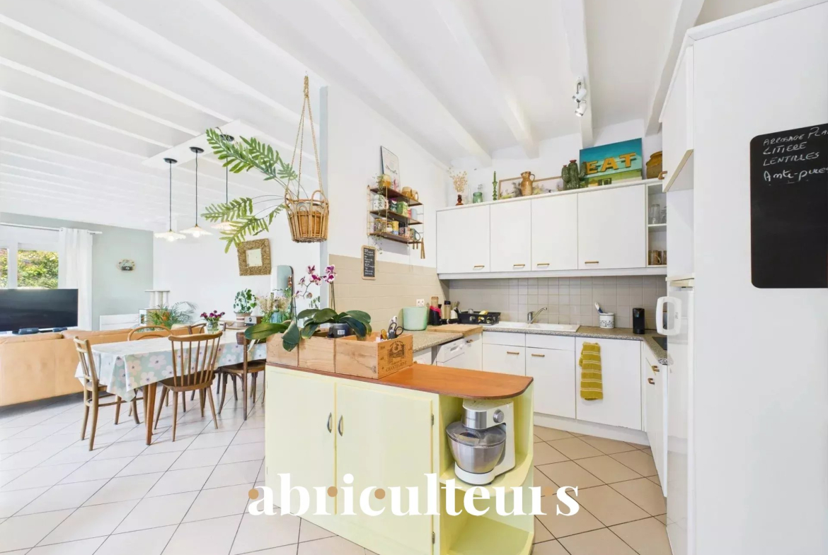 L’intérieur propose un séjour lumineux ouvrant sur une terrasse couverte conviviale, une cuisine semi-ouverte, deux chambres confortables, un bureau, ainsi qu’une salle de bains. Un garage attenant et accessible directement depuis la cuisine ajoute une touche de confort au quotidien.