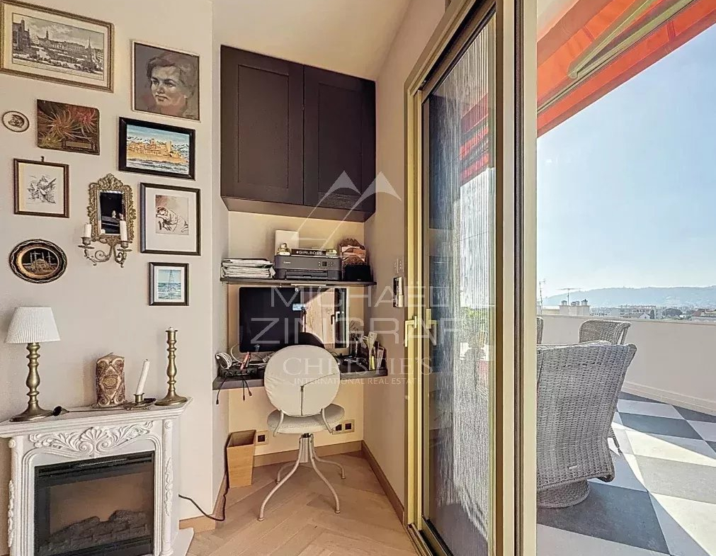 Le vaste séjour, baigné de soleil, s’ouvre sur une spectaculaire terrasse d’environ 65 m² exposée plein sud, véritable prolongement de l’espace de vie, offrant une vue dégagée sur la mer et les collines. Un lieu idéal pour recevoir, se détendre ou profiter pleinement du climat azuréen.