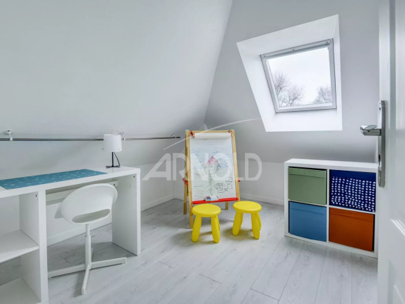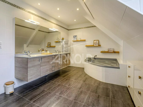 À l’étage, les volumes sont tout aussi appréciables. On y découvre une chambre avec placards et salle d’eau privée, une salle de bains avec douche, ainsi que deux autres chambres dotées de placards intégrés. Un dressing spacieux et des toilettes séparées viennent parfaire le niveau.