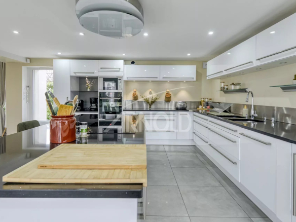 La cuisine, ouverte sur la pièce principale, bénéficie de baies vitrées coulissantes et est entièrement aménagée et équipée. Elle dispose également d’une cave à vins.