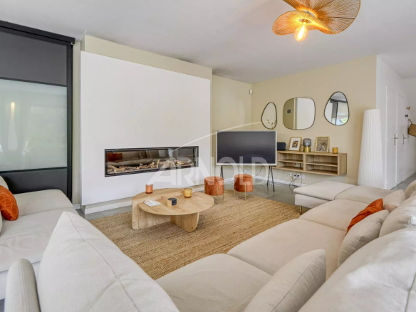 Les volumes généreux de cette demeure en très bon état se répartissent harmonieusement sur deux niveaux. Dès l’entrée, un hall spacieux conduit à une vaste pièce de vie de 70m2 comprenant un séjour avec cheminée au gaz, apportant une atmosphère chaleureuse et conviviale.