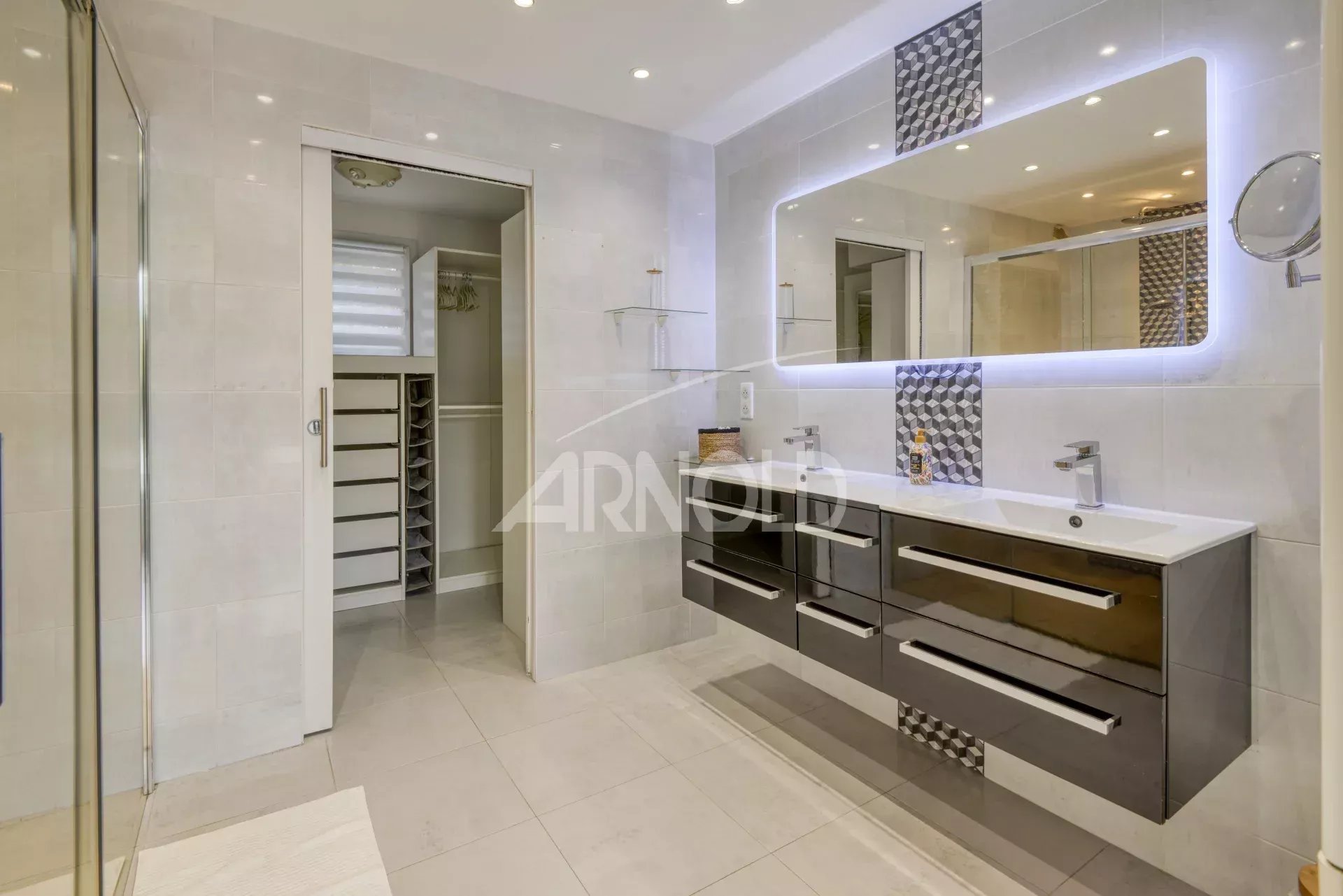 Le rez-de-chaussée accueille également une vaste suite parentale, offrant un confort de vie de plain-pied avec son grand dressing et sa salle d’eau privative, baignée de lumière et parfaitement agencée.