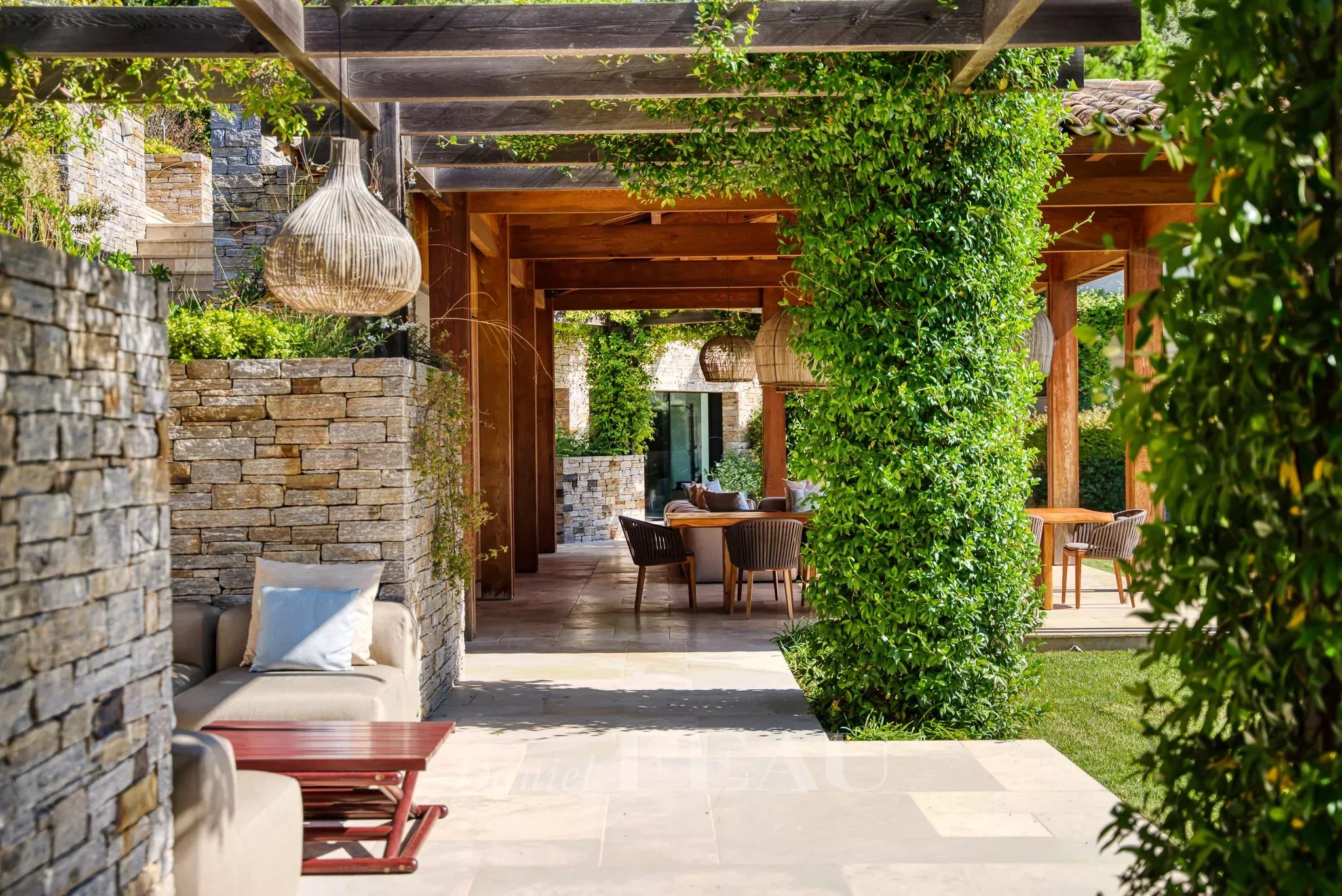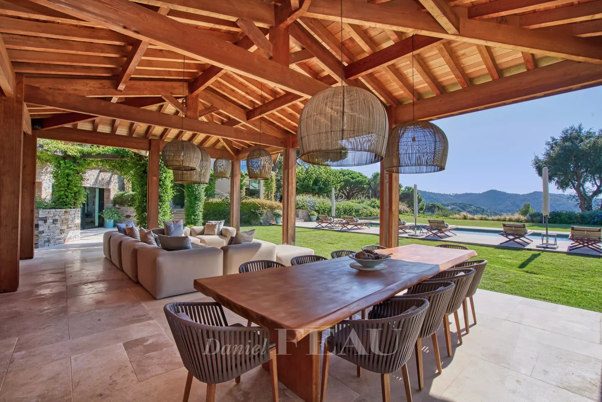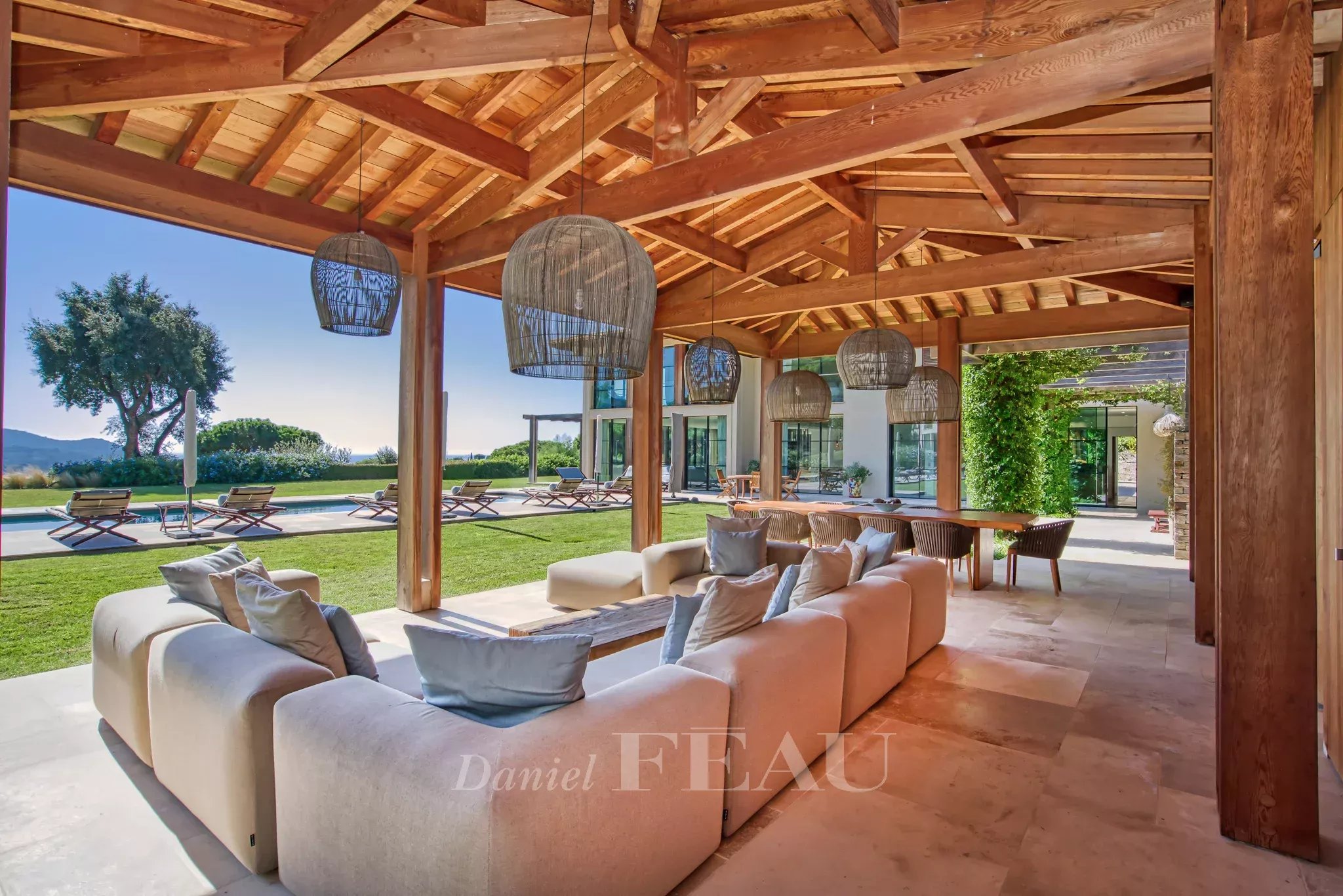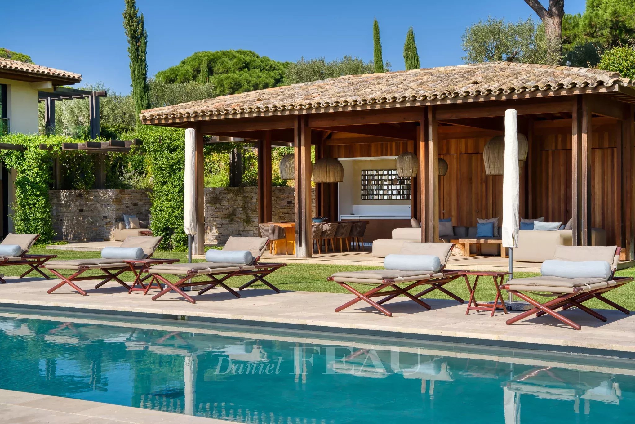 Un chemin nous amène ensuite sur une véritable pièce de vie outdoor face à la piscine de 20 m de long.