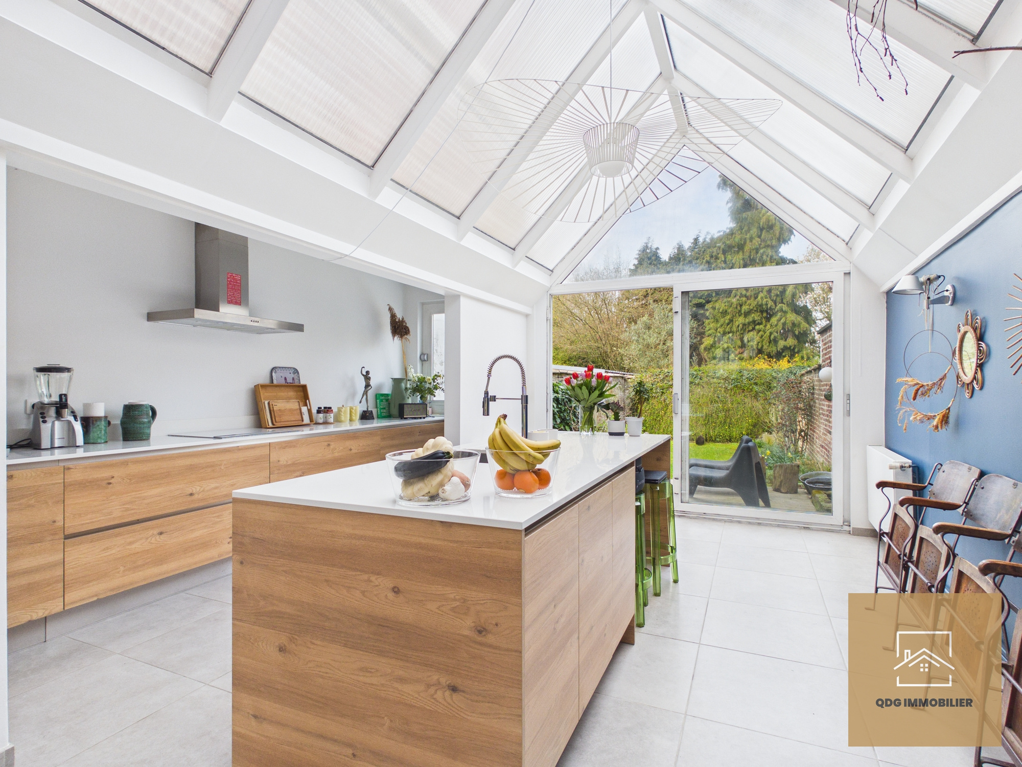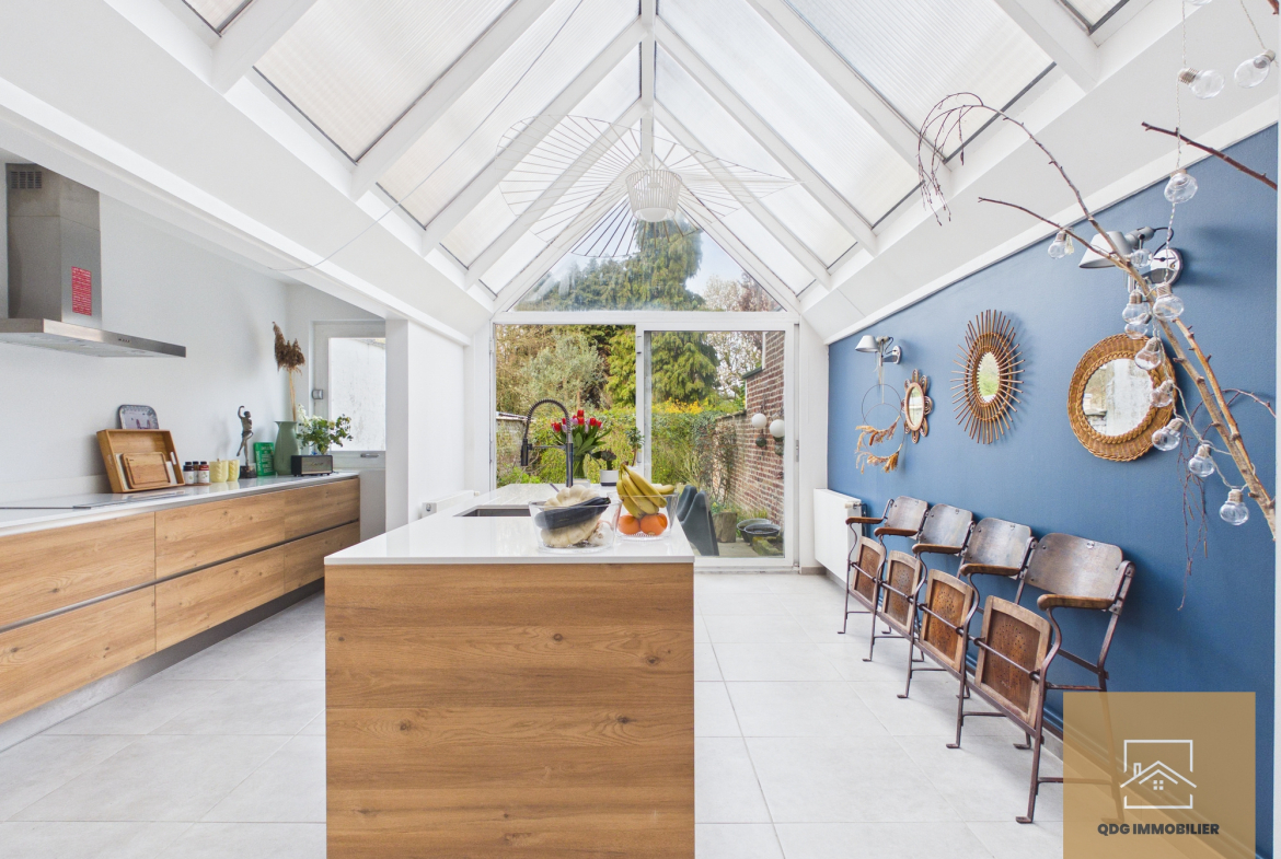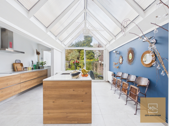 La maison offre une magnifique pièce de vie traversante, chaleureuse et baignée de lumière, ainsi qu’une cuisine conviviale sublimée par une élégante verrière, apportant un véritable cachet supplémentaire.