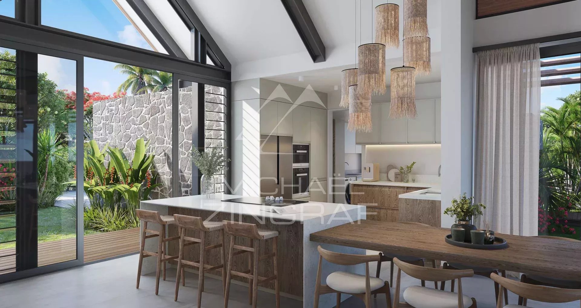 La villa Demera Signature incarne un mariage parfait entre tradition et modernité. Inspirée de l’architecture mauricienne, elle se distingue par sa toiture courbe, ses murs en pierres naturelles avec joints à cordons blancs d’antan et ses finitions en bois, offrant une esthétique chaleureuse et authentique. Pensée pour s’intégrer harmonieusement dans son environnement, elle privilégie la lumière naturelle et une ventilation optimale, créant des espaces de vie lumineux et aérés.