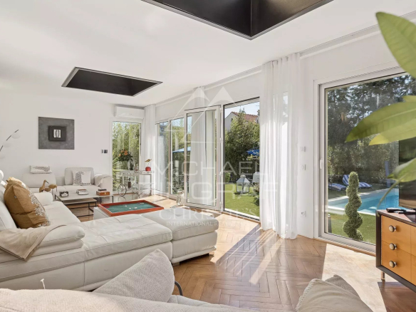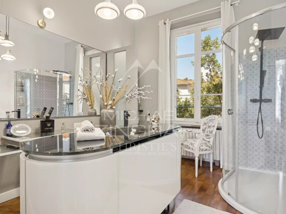 Cette élégante villa Art Déco séduit par son charme intemporel, ses volumes généreux et sa décoration raffinée. Idéalement située dans le quartier résidentiel prisé du Cannet-Europe, elle allie calme absolu et proximité des commodités. Exposée plein sud et desservie par un ascenseur accessible PMR, la villa développe environ 270 m² et comprend un double salon lumineux, une cuisine contemporaine entièrement équipée, ainsi que quatre chambres, dont trois suites avec salles de bains privatives. Un spa maçonné à double bassin et une buanderie complètent ce bien. À l’extérieur, un jardin plat et paysager met en valeur une piscine récemment créée, idéale pour profiter du climat méditerranéen en plein centre-ville.