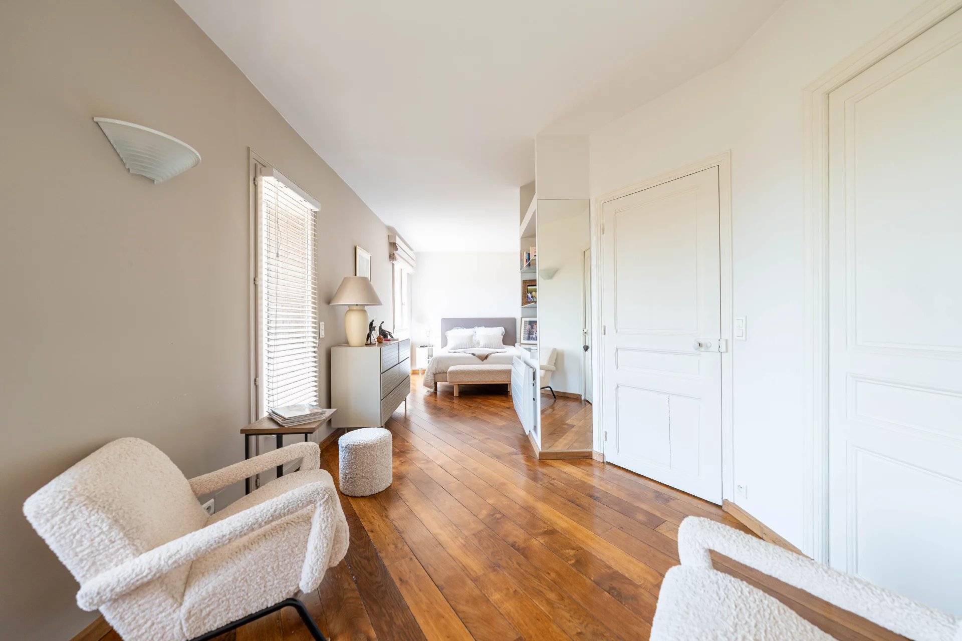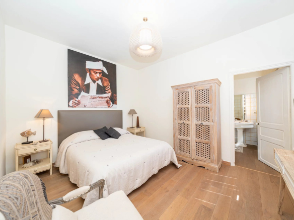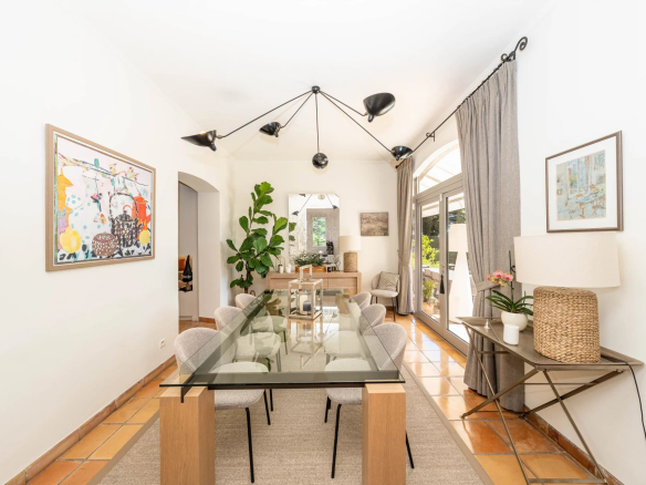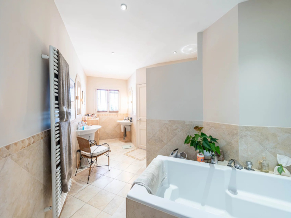 Elle se compose d’une grande et lumineuse cuisine d’un bel espace de réception avec salle à manger et salon avec cheminée, 2 chambres, 2 salles de bains, un bureau, de nombreux dressings.
