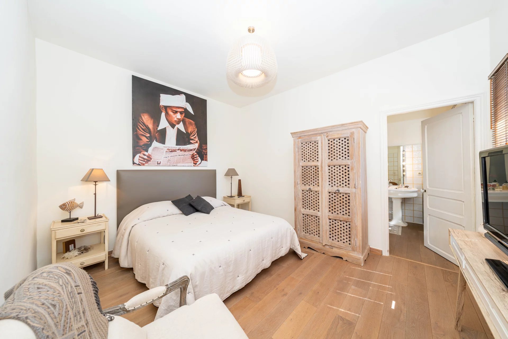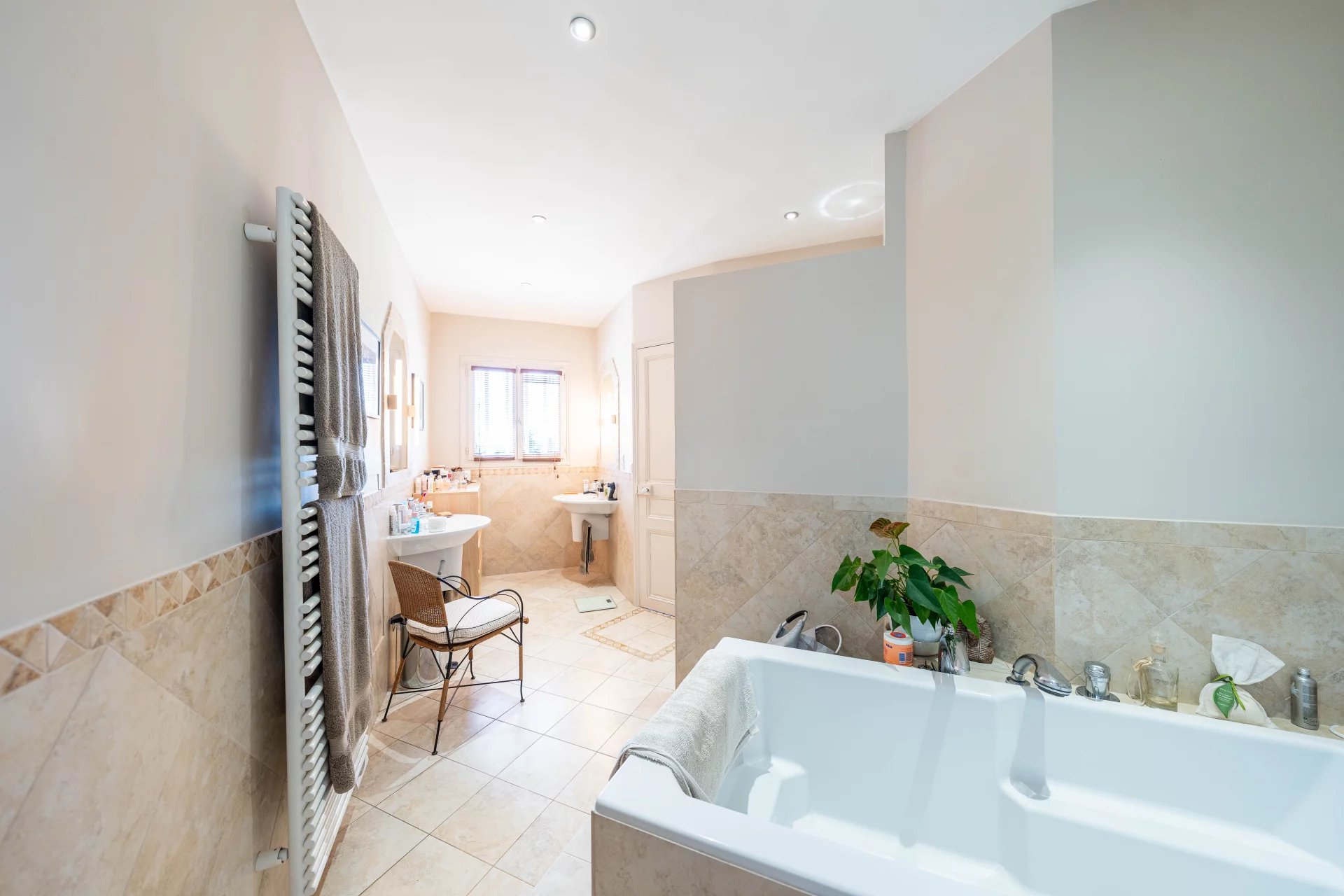 A l’étage: une belle suite parentale avec sa salle de douche et bains ouvrant sur une terrasse.
