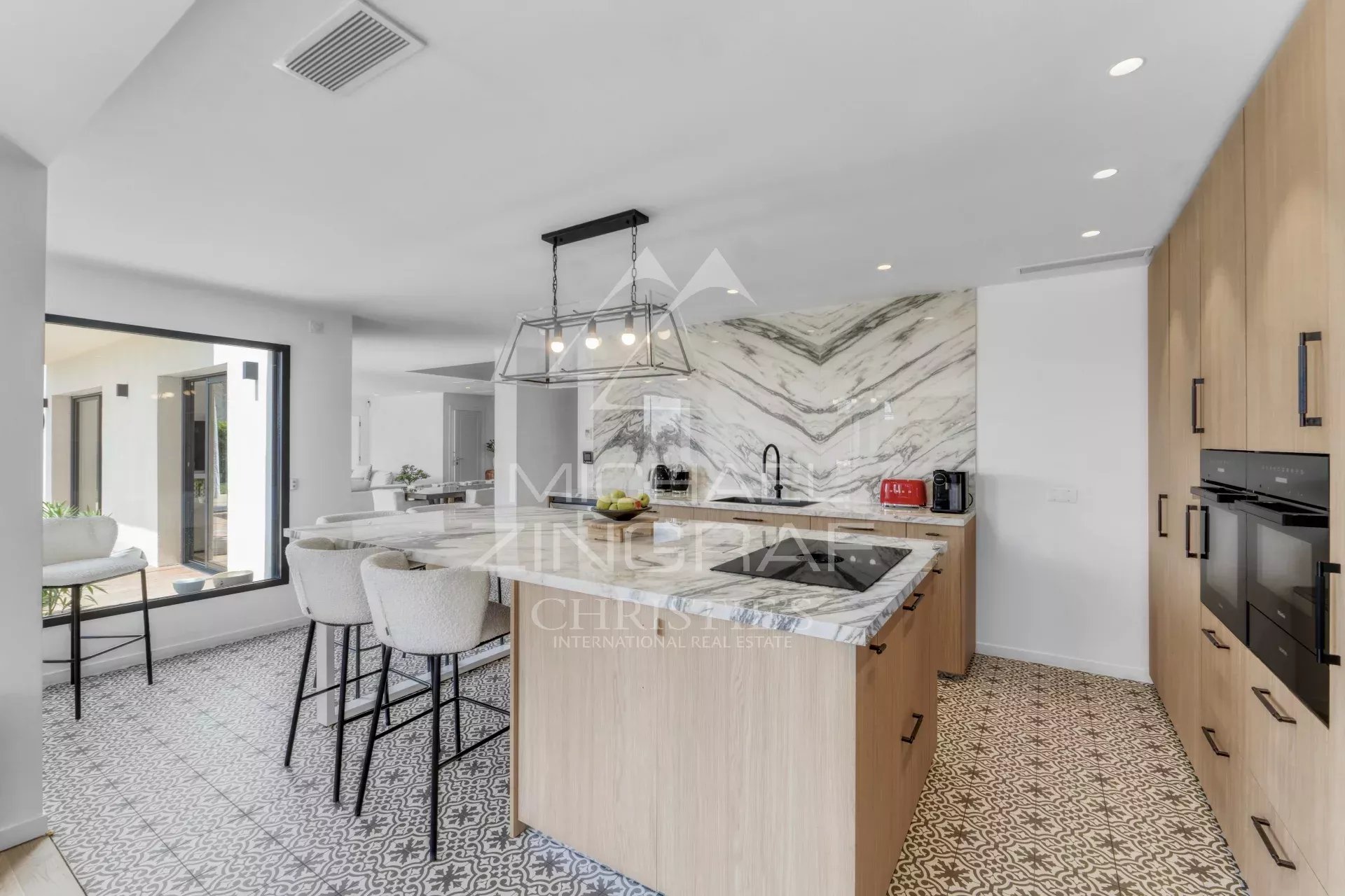 D’une surface d’environ 247 m² incluant le garage, elle propose une belle pièce de vie lumineuse d’environ 70 m² regroupant salon, salle à manger et cuisine ouverte, avec accès direct aux terrasses extérieures et à la piscine.