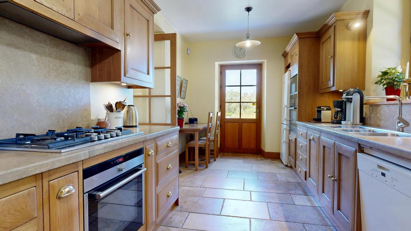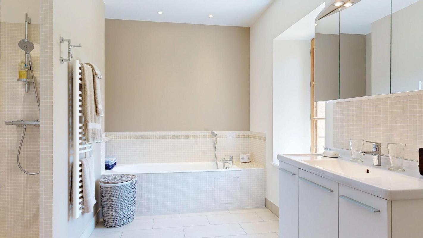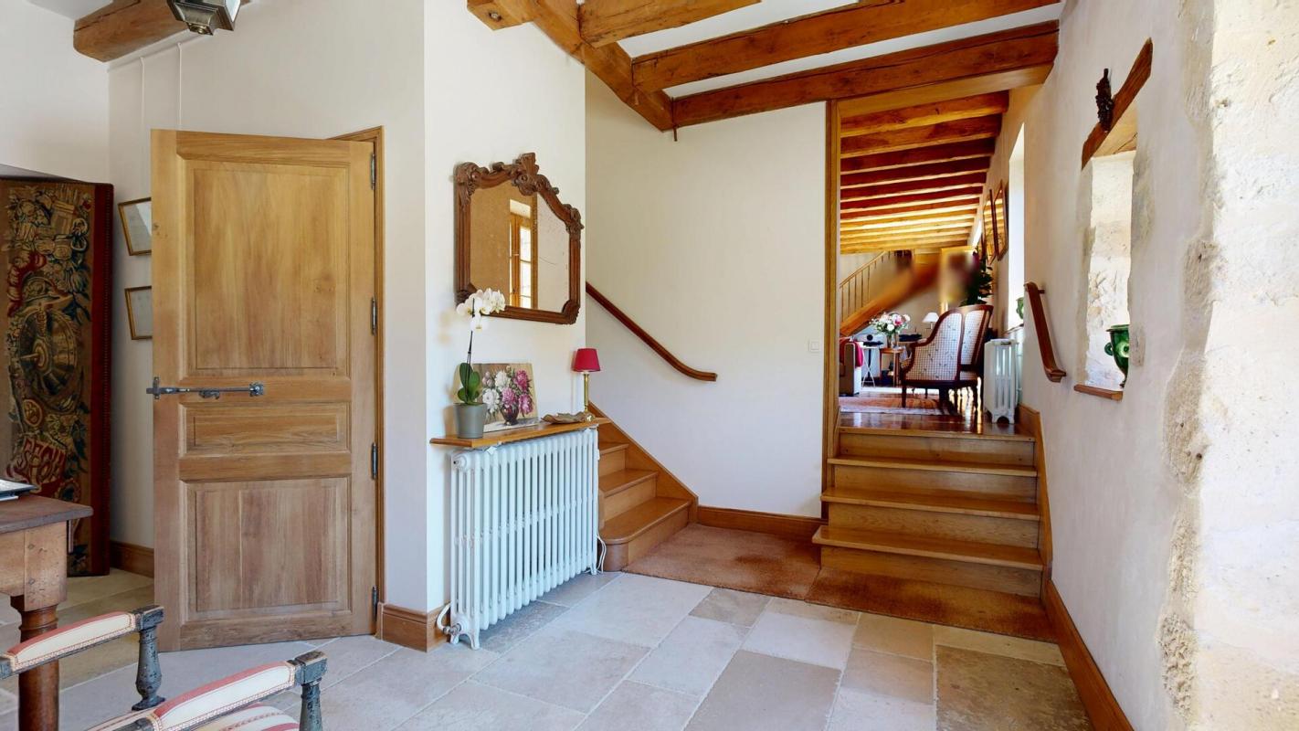 La demeure principale, datant de 1860, a fait l’objet d’une restauration sans compromis. Chaque détail reflète une exigence rare, mêlant confort contemporain, nobles matériaux et respect du patrimoine. La performance énergétique (classée B) témoigne de la qualité des choix techniques, avec une isolation en chanvre, des toitures refaites à neuf et un système de chauffage performant.