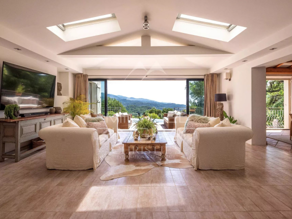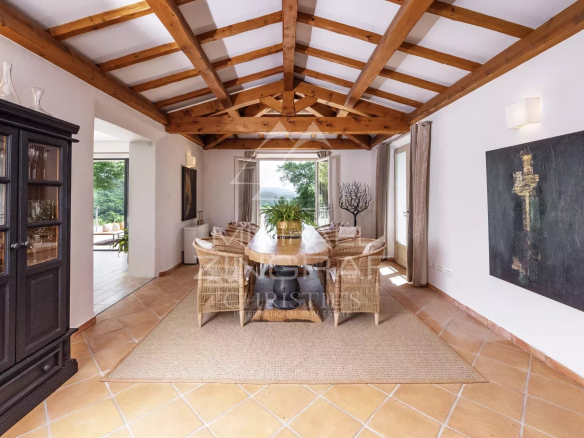 Au cœur de l’Estérel, dans le secteur des Adrets de l’Eglise, superbe propriété d’environ 230m2 avec vue mer, sur un terrain d’un hectare. Dès l’entrée, vous serez subjugués par l’ampleur de l’espace de vie, baigné de lumière naturelle, avec une très belle hauteur sous plafond et poutres apparentes, salle à manger, salon et cuisine aménagée s’ouvrent sur l’espace extérieur. Côté nuit de plain-pied, se trouve 3 chambres, 2 salles de bain et un wc indépendant. A l’étage, un joli dégagement avec coin lecture surplombe l’espace cuisine et amène à la chambre parentale avec salle de bain et terrasse privative.