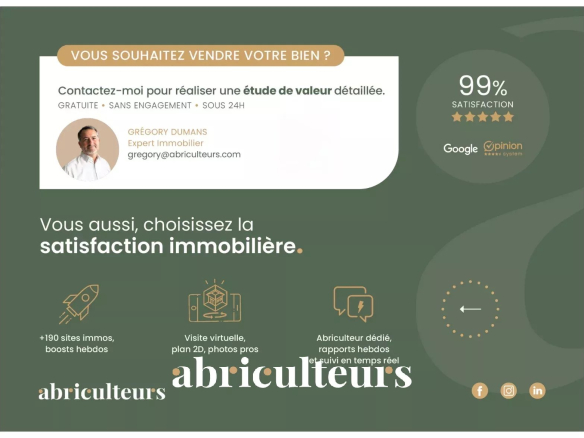 Annonce rédigée sous la responsabilité éditoriale de Grégory Dumans, agent commercial (EI), immatriculé au RSAC de PARIS sous le n° ADC 7501 2025 000 001 768, sans détention de fonds, agissant pour le compte de la SARL Abriculteurs immobilier, au capital de 5 000 €, immatriculée sous le SIREN n° 837 704 584, titulaire de la carte professionnelle n° CPI 7501 2018 000 025 842 délivrée par la CCI de Paris Île-de-France, dont le représentant légal est M. Adrien Piot, ayant son siège social au 12 rue des Halles, 75001 Paris.