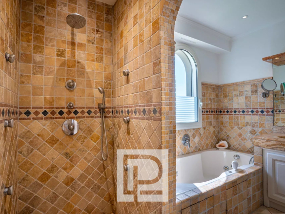 La villa dispose de prestations complètes : chauffage au sol, climatisation, alarme, finitions récentes. Les espaces de vie s’ouvrent largement sur un jardin accueillant une piscine au sel, un terrain de tennis, un terrain de pétanque et une vaste cuisine d’été avec barbecue Weber.