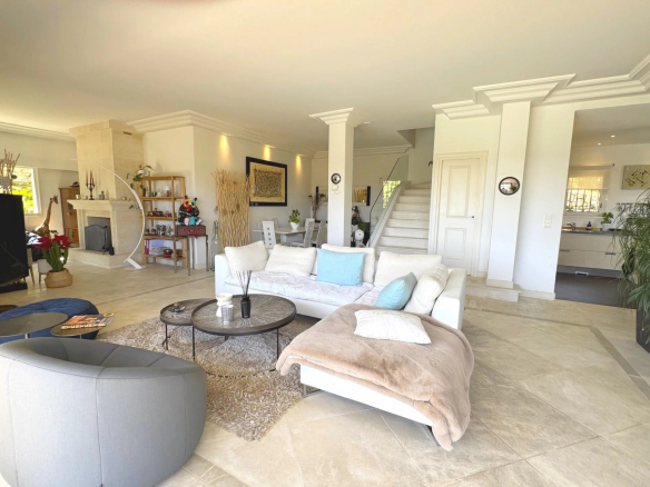 L’intérieur spacieux comprend un grand salon, une salle à manger conviviale et une cuisine entièrement équipée, tous ouvrant sur le jardin et la piscine pour profiter pleinement du cadre extérieur.