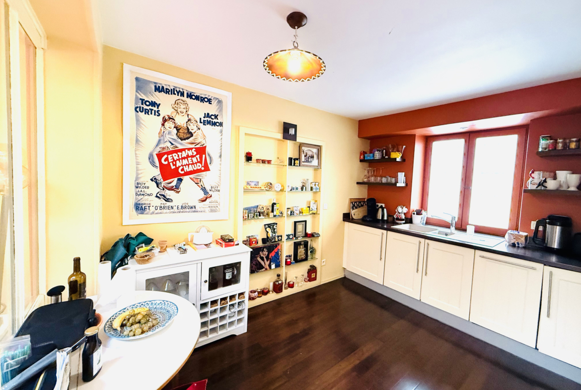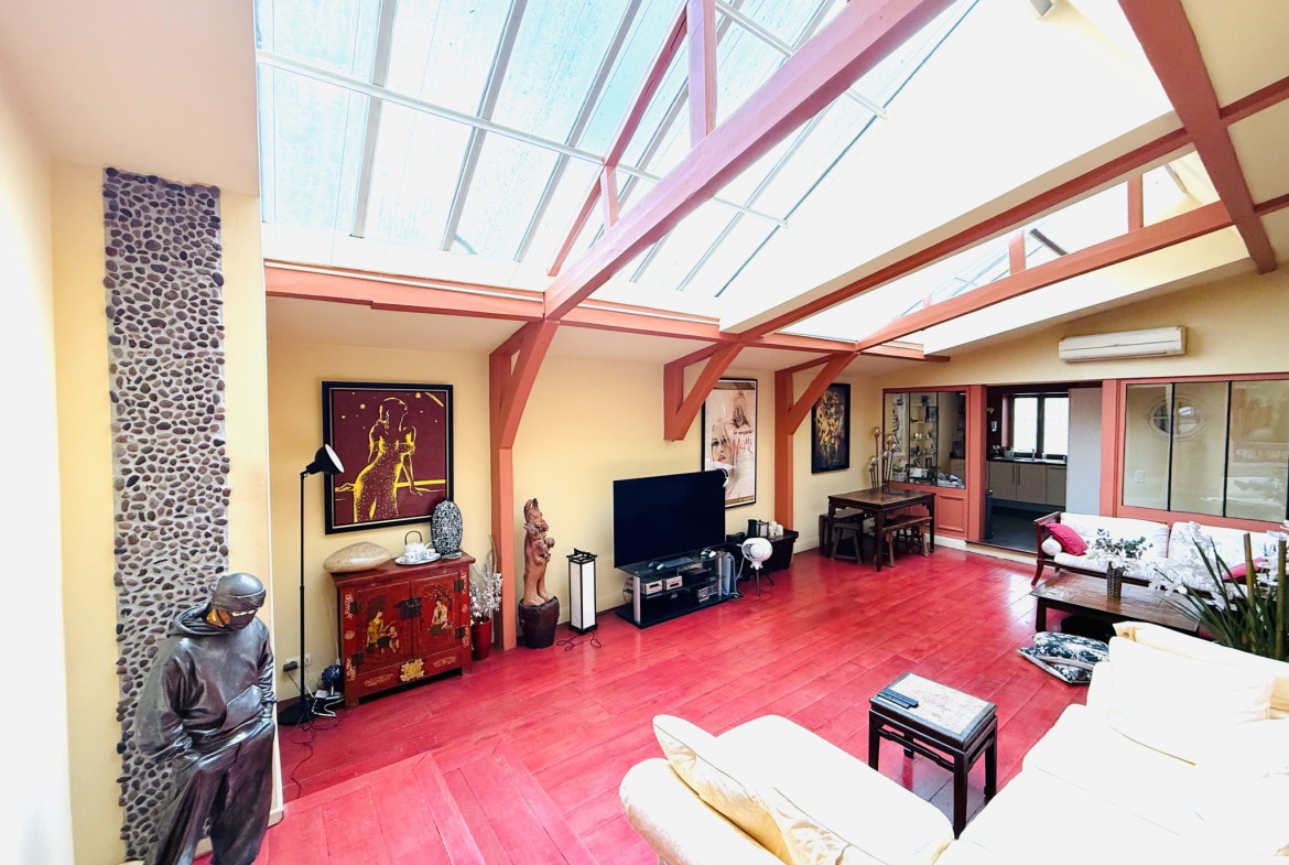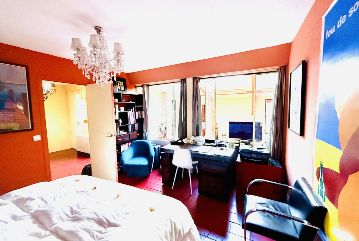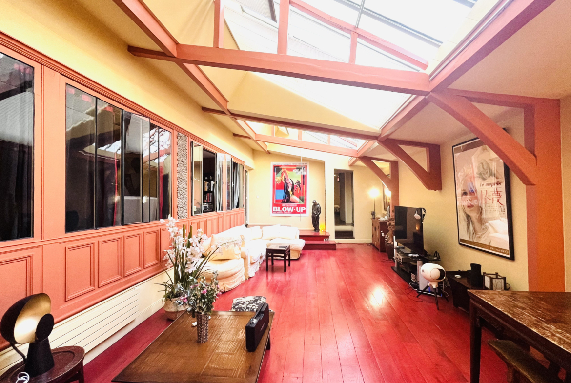 Dès les premiers pas, le charme opère : une entrée discrète ouvre sur un espace de vie spectaculaire d’environ 50 m2, composé d’un séjour cathédrale de 40 m2 et d’une cuisine élégante et conviviale de 11 m2. La verrière d’atelier diffuse une lumière naturelle généreuse, sublimant les volumes et une hauteur sous plafond impressionnante de 4,10 m. Cet espace, à la fois chaleureux et inspirant, invite à la détente, à la création et au partage.