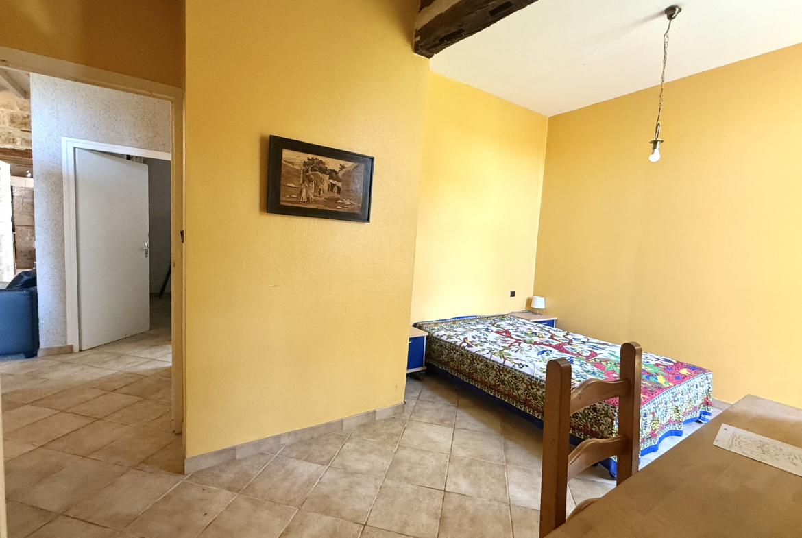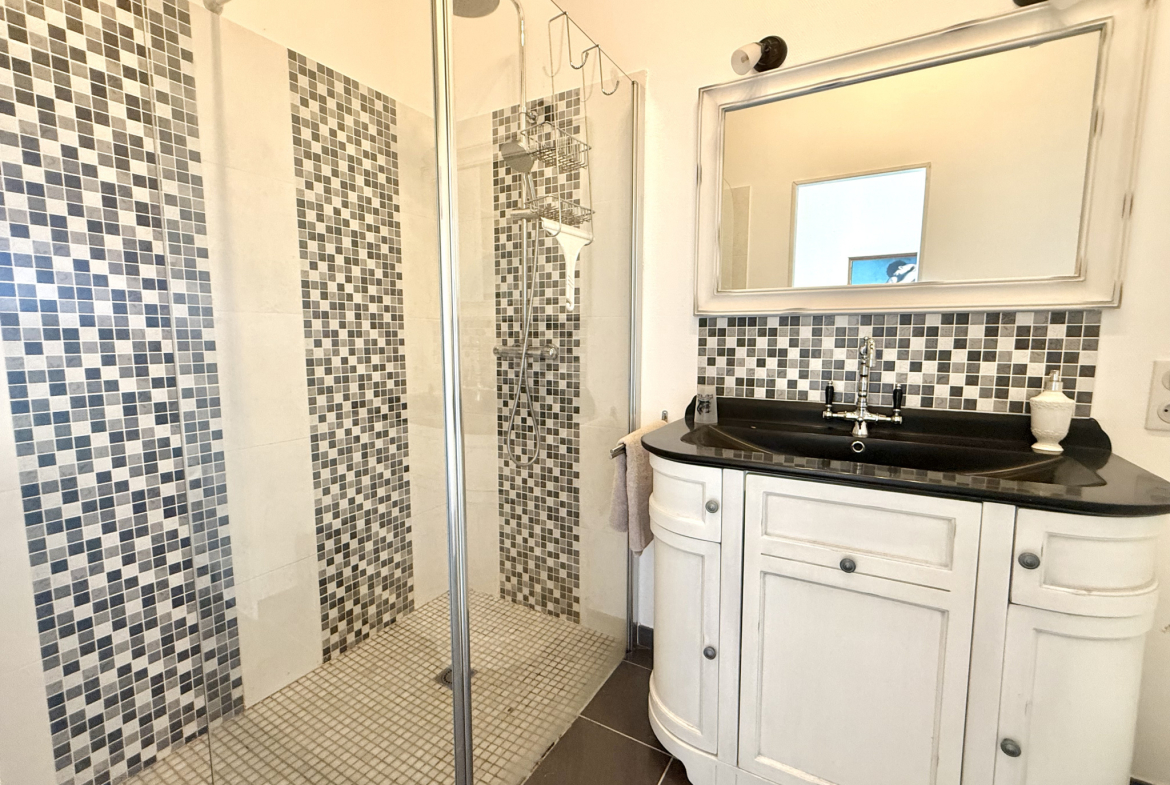 La partie gauche de la maison principale comprend deux chambres confortables, une grande salle d’eau, une buanderie, ainsi qu’une cuisine fonctionnelle ouverte sur la salle à manger. Le salon, spacieux et chaleureux avec sa cheminée en pierre, s’ouvre sur une terrasse qui mène directement à la piscine chauffée, équipée d’un système de nage à contre-courant.
