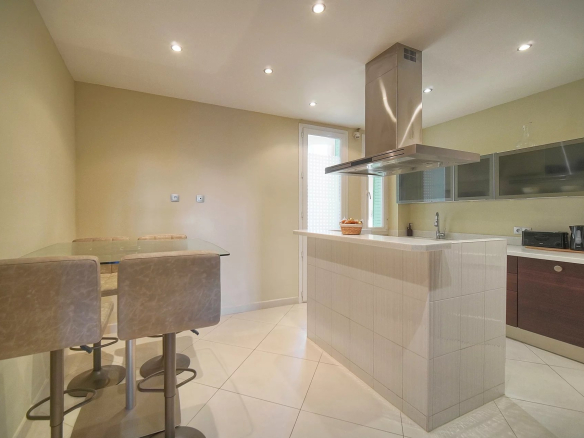 L’intérieur est décoré avec goût, intégrant des meubles contemporains qui se marient parfaitement avec les tons neutres des murs. Le salon s’ouvre sur une salle à manger, spacieuse et conviviale, parfaite pour les repas et les réceptions. Sa disposition ouverte offre une circulation fluide et agréable entre les espaces de vie.