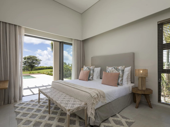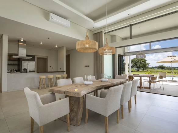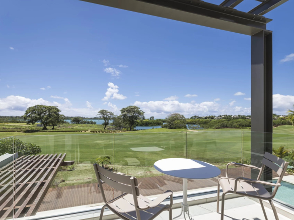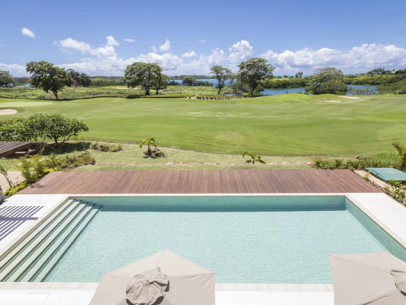 Située au bord du golf, elle offre de magnifiques perspectives sur le parcours et sur le lagon qui lui font face.