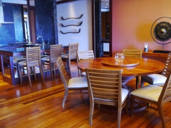 La salle à manger est spacieuse et suffisamment grande pour accueillir confortablement 6 à 8 personnes. L’espace principal de vie et de détente est situé légèrement plus bas que le reste de la résidence, ce qui rend l’espace à la fois fonctionnel et agréable à regarder.