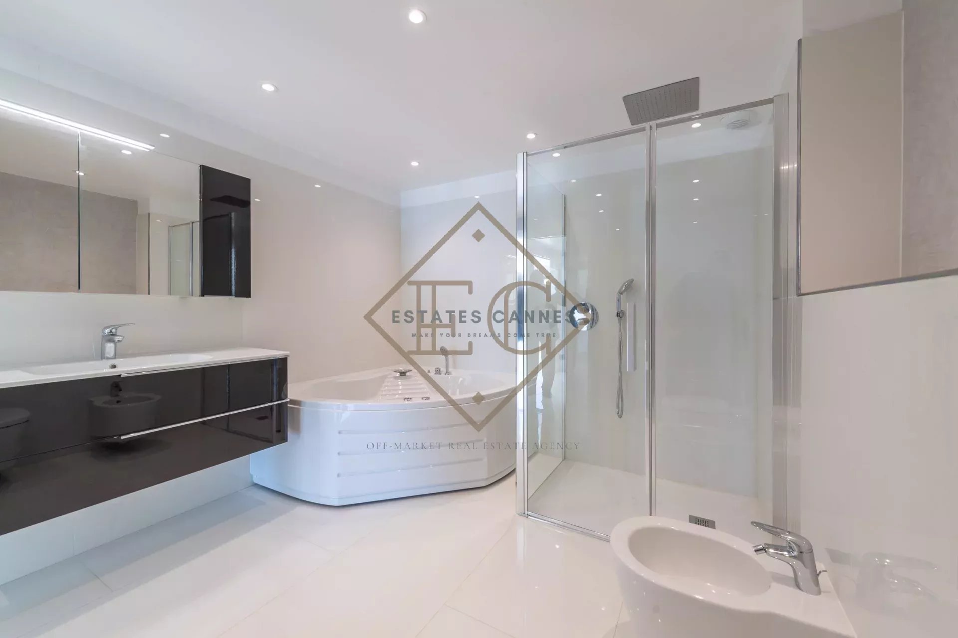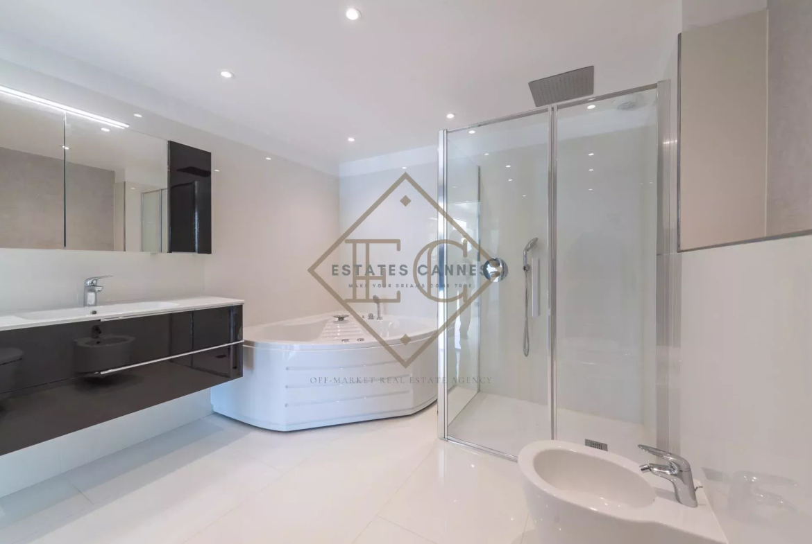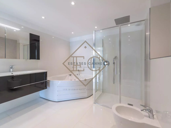 Les salles de bains, réalisées avec des matériaux haut de gamme, disposent d’un plan vasque raffiné, d’un radiateur sèche-serviette, d’une douche avec pare-douche en verre et d’une baignoire balnéo pour des moments de relaxation absolue.