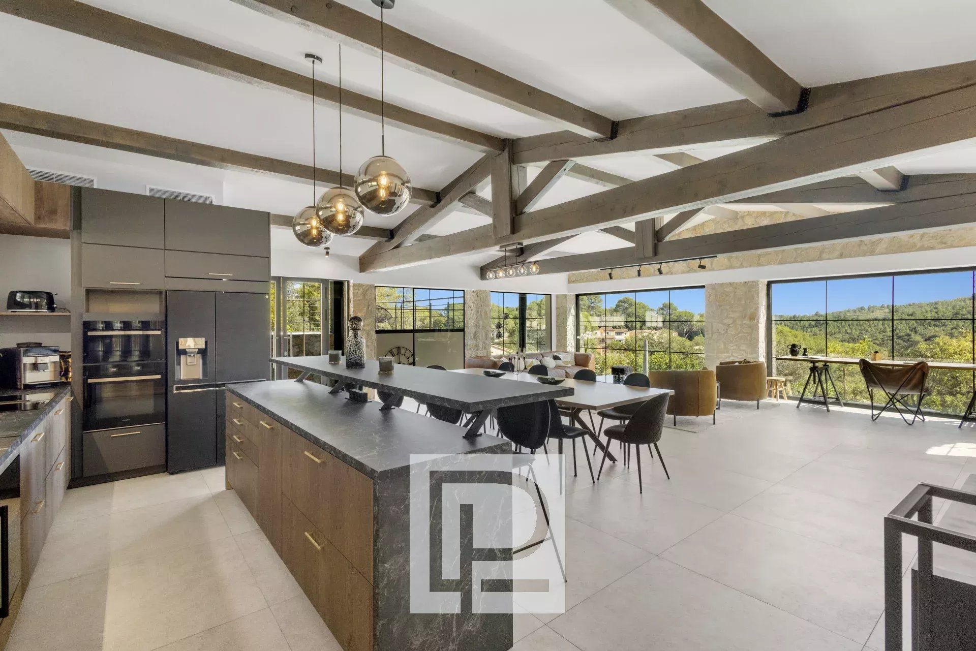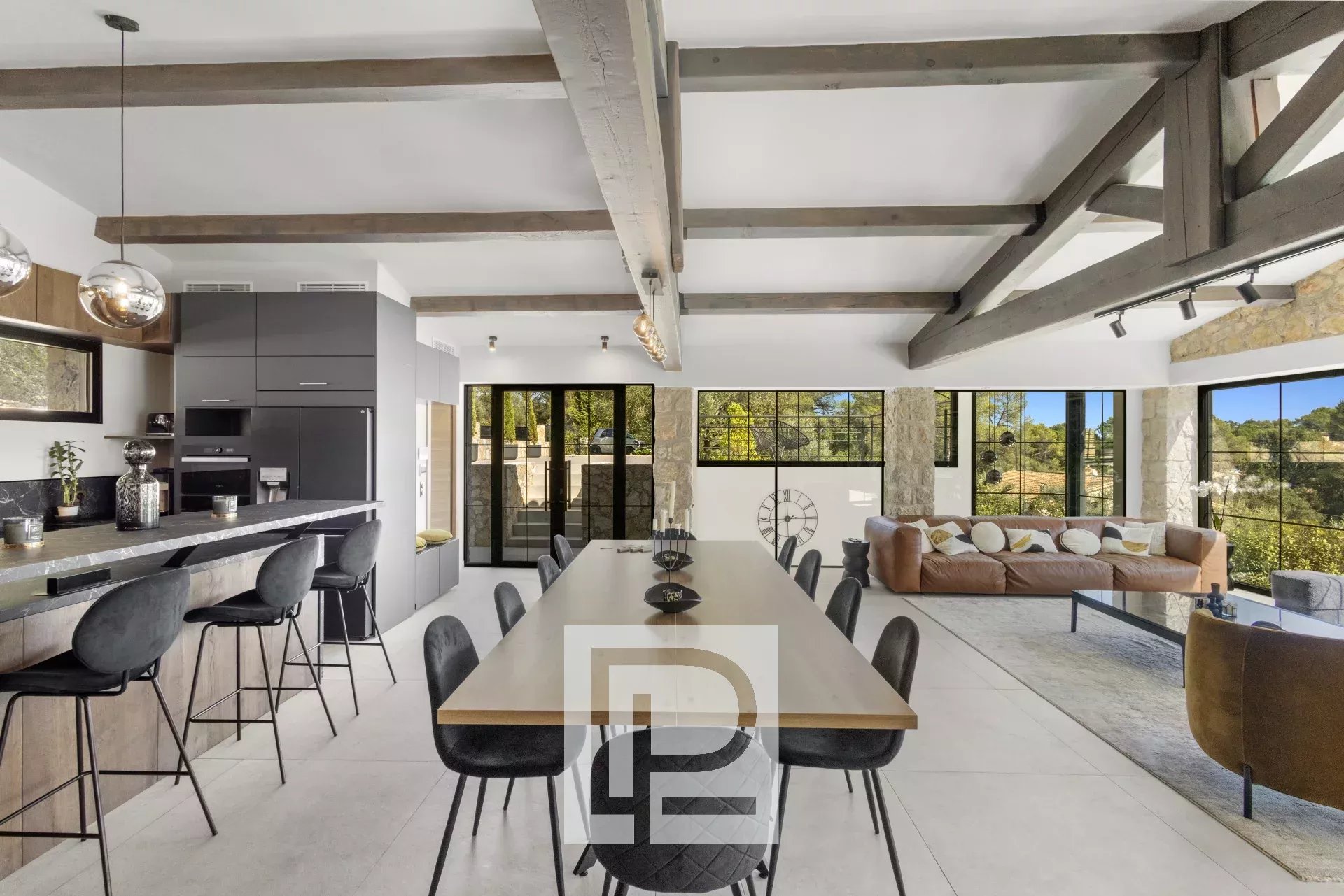 Vaste espace de vie avec séjour et cuisine américaine équipée, baigné de lumière grâce à ses larges ouvertures vitrées de chaque côté.