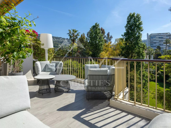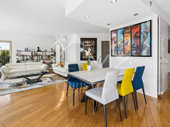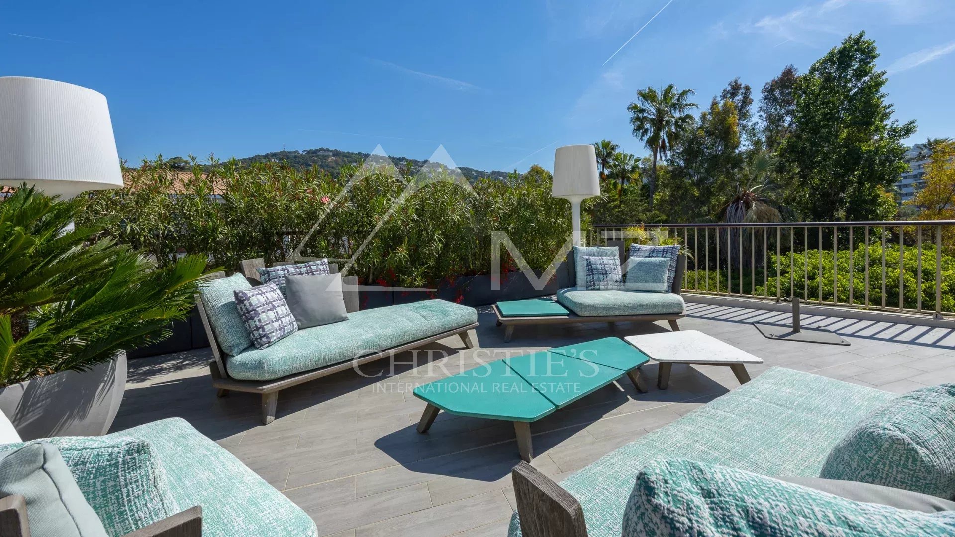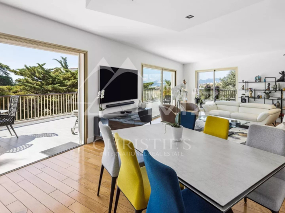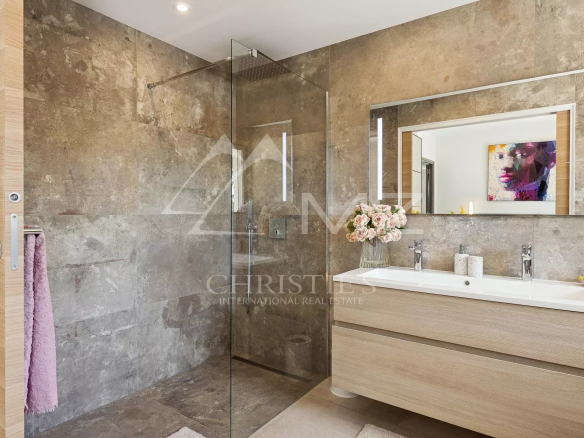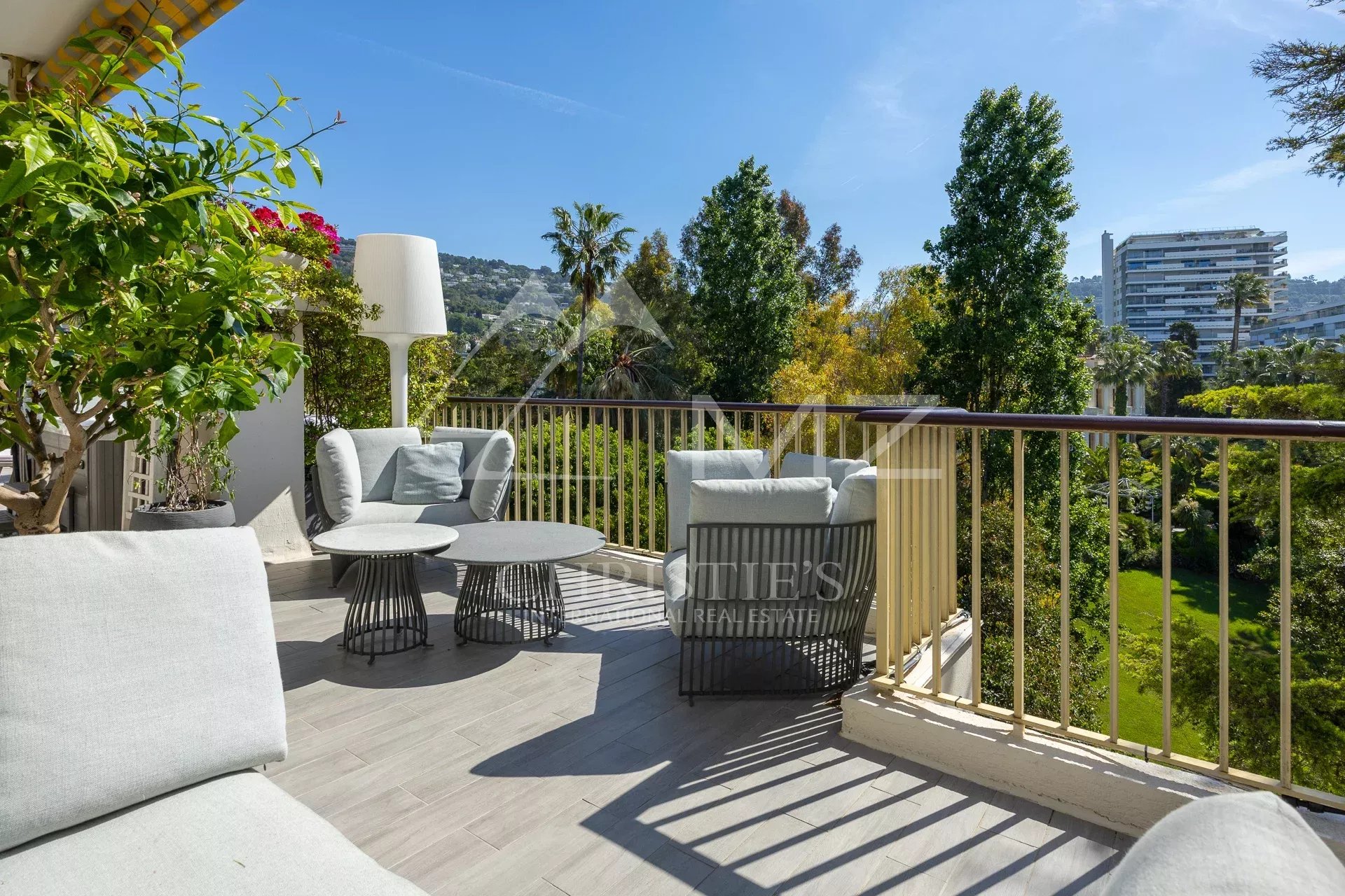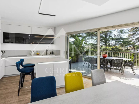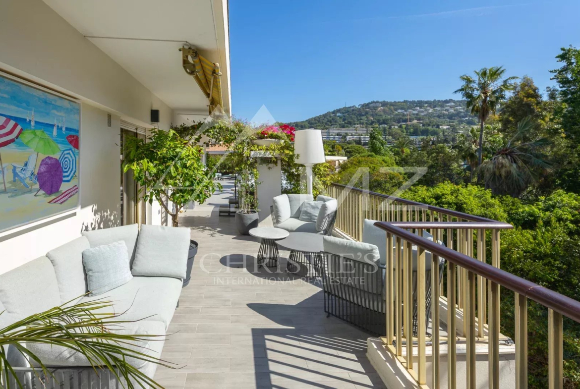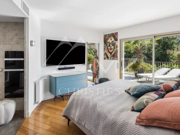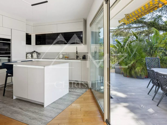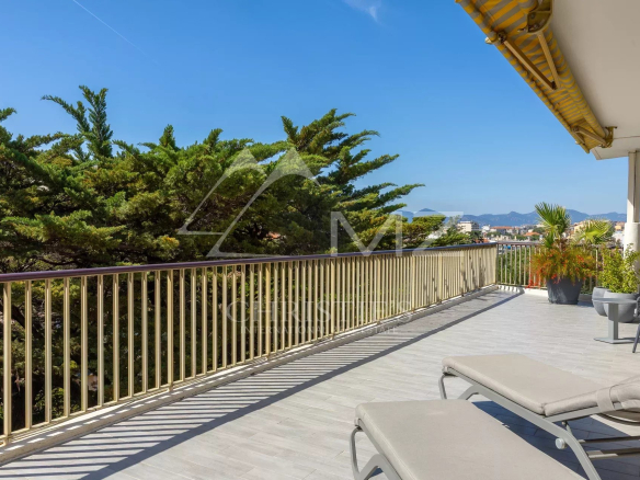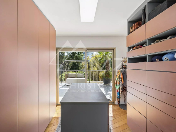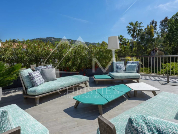 Coup de cœur pour ce penthouse niché dans la verdure dans un quartier résidentiel. Avec sa terrasse arborée de 280 m², cet espace extérieur, agrémenté d’un spa, se transforme en un jardin luxuriant, offrant différentes ambiances pour se détendre ou recevoir et profiter de la vue sur les collines et du bel aperçu mer.