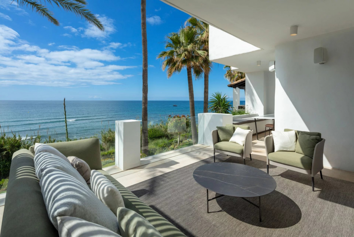 Orquidea 22 est un charmant penthouse en duplex niché en première ligne de la plage de Puente Romano, offrant un emplacement privilégié au sein de la communauté fermée d’Orquidea. Cette propriété remarquable présente une vue imprenable sur la mer, un design intérieur impeccable par Ambience et une atmosphère irrésistible. Le rez-de-chaussée comprend un salon spacieux orné de portes coulissantes en verre du sol au plafond qui inondent l’espace de lumière naturelle. Méticuleusement décorées avec des meubles et des finitions de bon goût, l’utilisation de tons neutres complétés par des touches de couleurs vives crée une atmosphère apaisante et invitante. Une cheminée à double face sépare de l’espace de vie l’exquise cuisine ouverte et les salles à manger. De ce niveau, un accès direct à la terrasse mène à une salle à manger couverte et à un espace de détente offrant une vue imprenable sur la mer. Chaque chambre est un sanctuaire luxueux avec salle de bains, méticuleusement conçu pour élever le confort et l’opulence. L’élégante chambre principale offre un grand espace et une superbe salle de bains, tandis que sa terrasse privée avec piscine et espace détente surplombe la mer, offrant une retraite unique et exclusive. Avec son orientation sud, Orquidea 22 incarne un paradis balnéaire, parfaitement positionné le long du prestigieux Golden Mile de Marbella.
