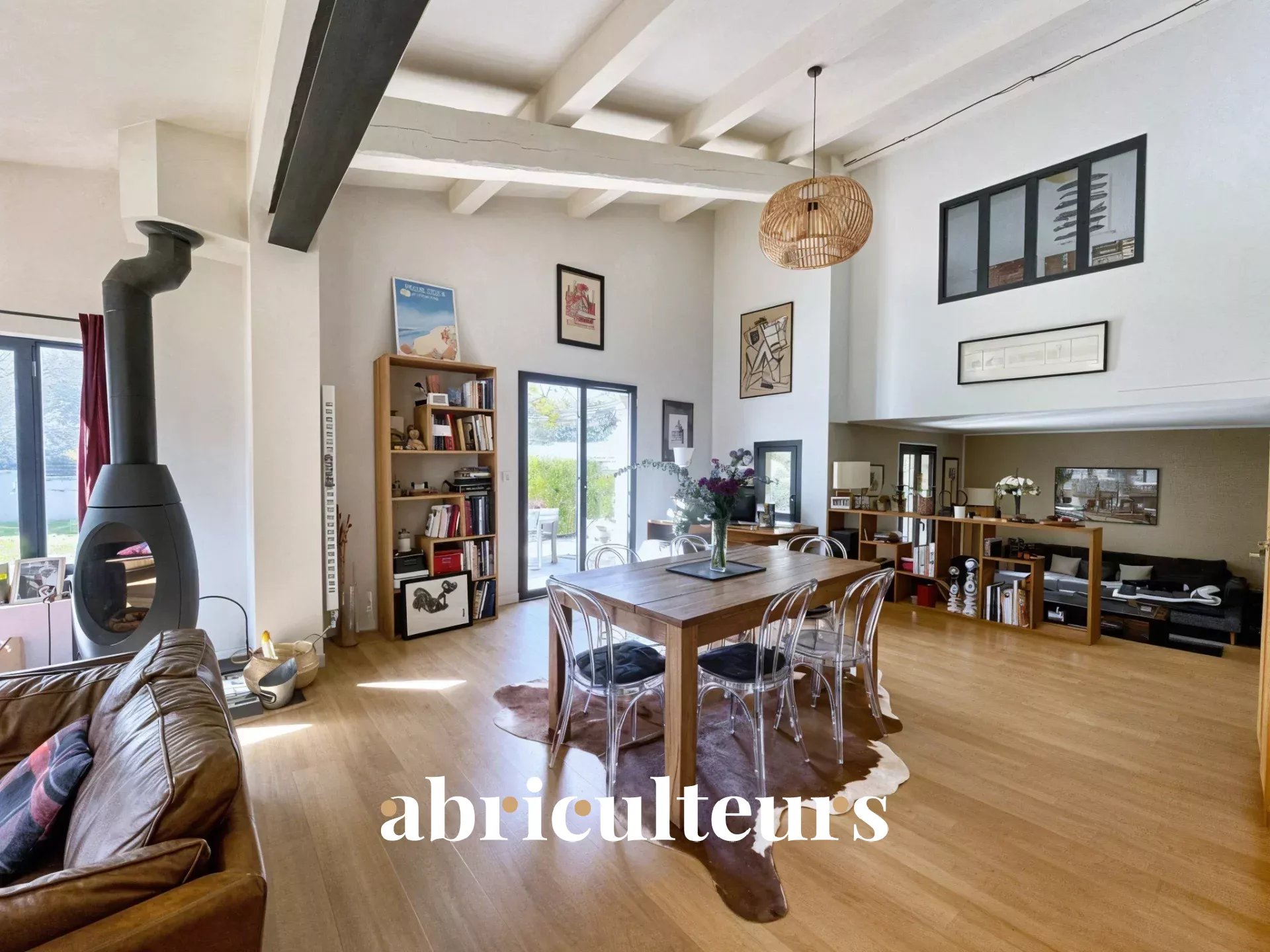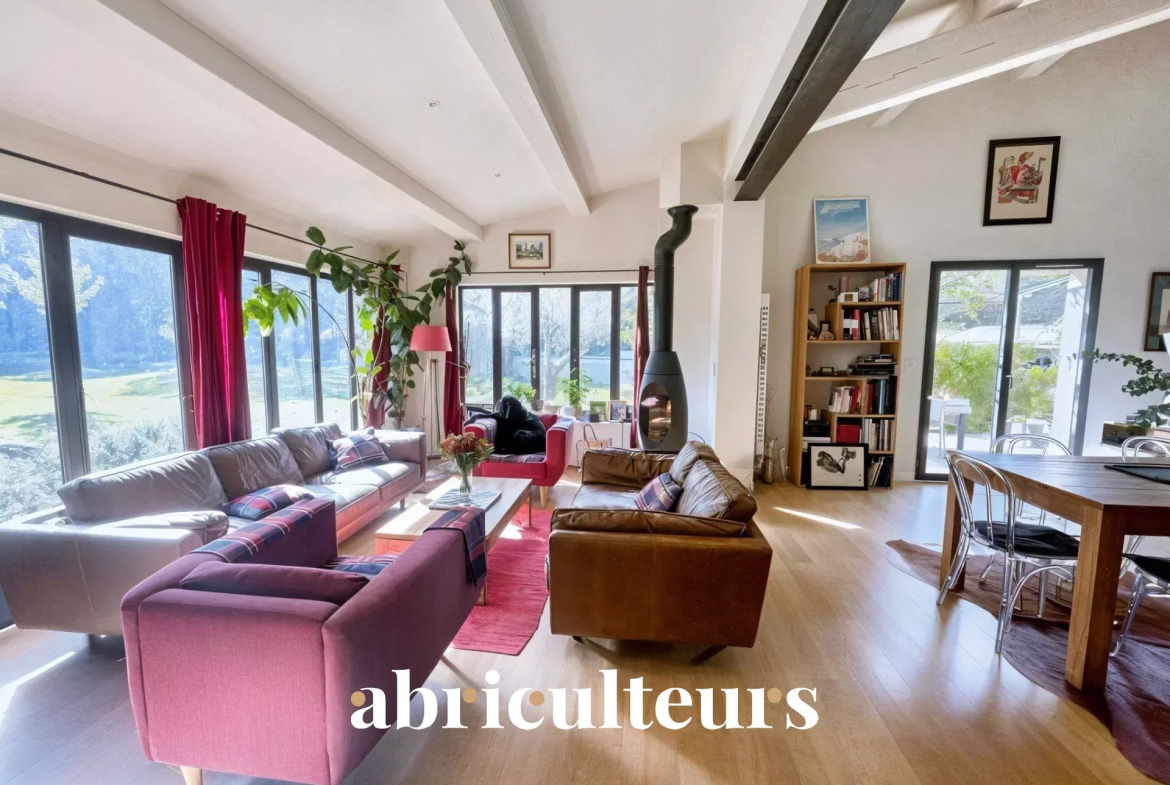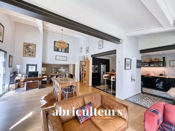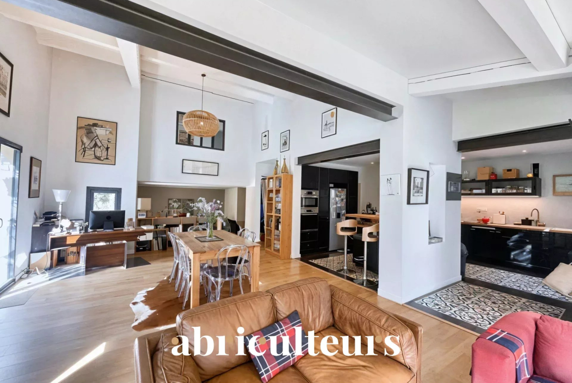 Rénovée avec goût en 2016, la maison principale offre 217 m² de confort et de lumière, répartis sur deux niveaux. Les espaces de vie s’ouvrent sur de belles terrasses arborées : une cuisine équipée à l’américaine, un vaste salon baigné de lumière avec verrière et poêle à bois, une salle à manger sous plafond cathédrale et un salon TV avec cheminée créent une atmosphère conviviale et chaleureuse. Deux suites parentales avec salle de bain au rez-de-chaussée, des toilettes, un bureau et une buanderie complètent ce niveau.
