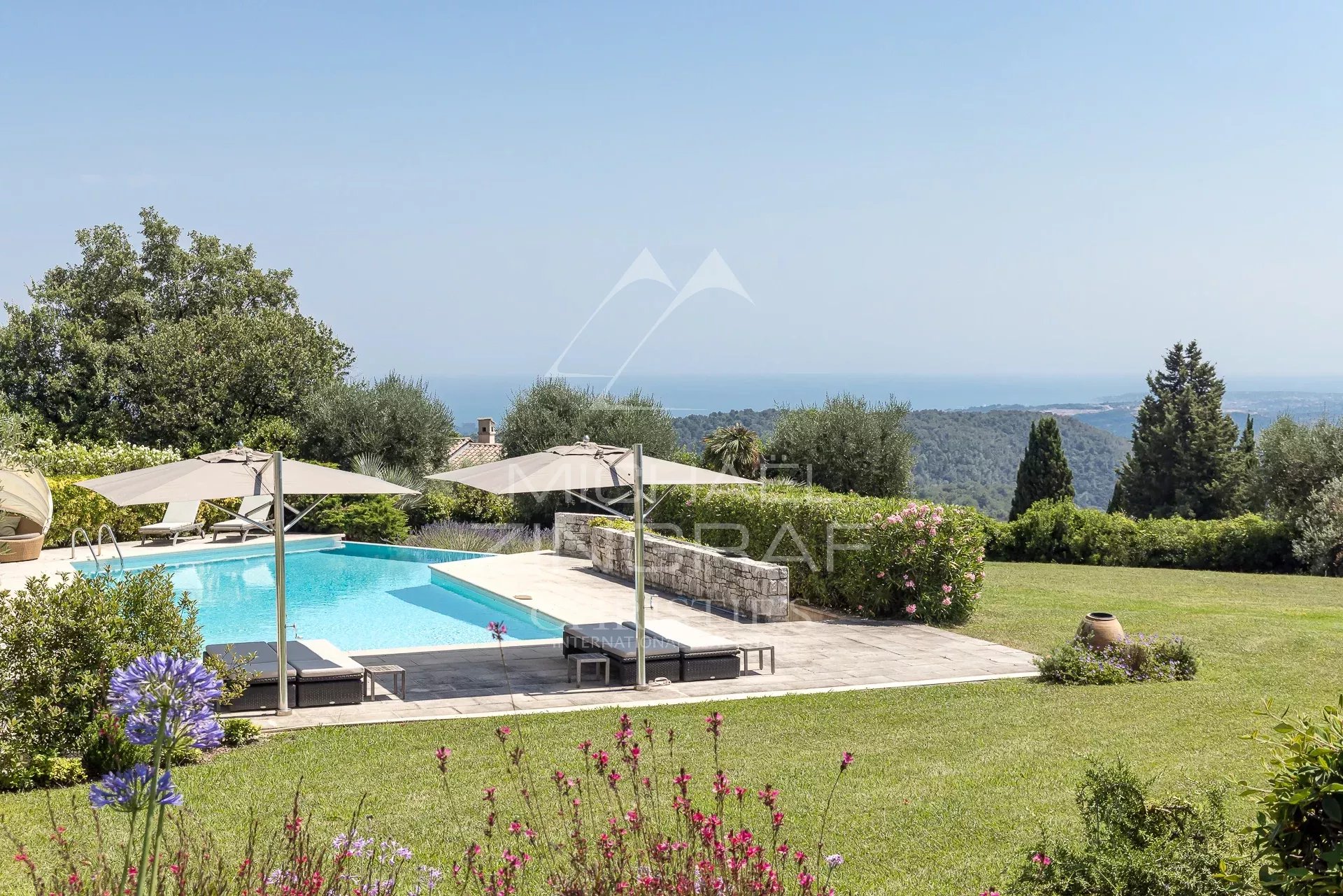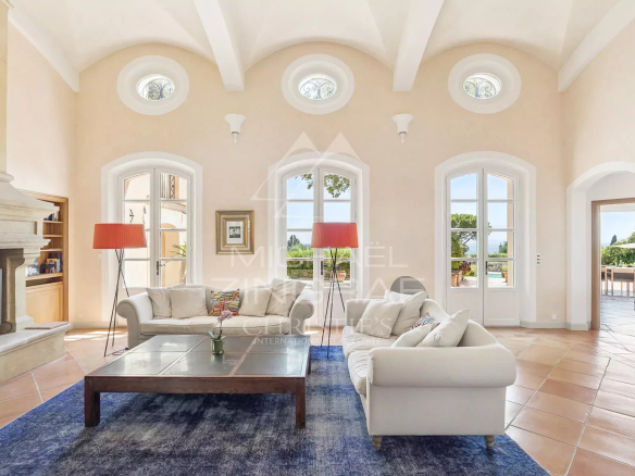 À quelques pas du village, cette remarquable propriété provençale, construite par le célèbre architecte André Svetchine et récemment rénovée dans le respect de son esprit par son fils Luc Svetchine, offre quelque 400 m² d’espaces de vie lumineux. Depuis les vastes terrasses et chacune des pièces, le regard embrasse un panorama exceptionnel sur la mer, du Cap Ferrat à l’Estérel, tandis qu’un jardin plat de 7 700 m² planté d’oliviers et d’essences méditerranéennes assure un cadre de quiétude rare.