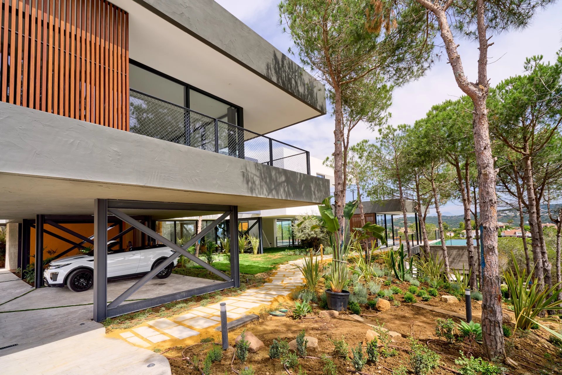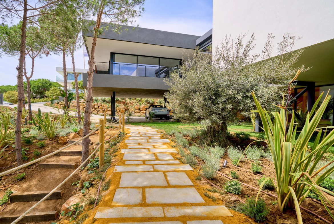 Une superbe villa individuelle moderne avec une vue panoramique exceptionnelle sur la vallée, la mer et les montagnes, entourée d’une forêt de pins mature.