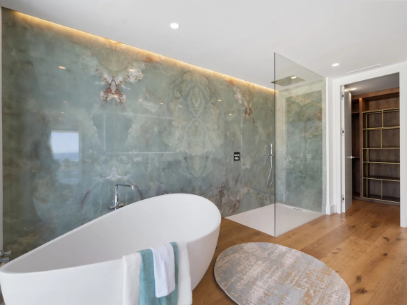 La Villa dispose du chauffage au sol partout, de murs en onyx dans la salle de bain principale, de finitions de qualité supérieure et d’un accès par ascenseur à tous les étages.