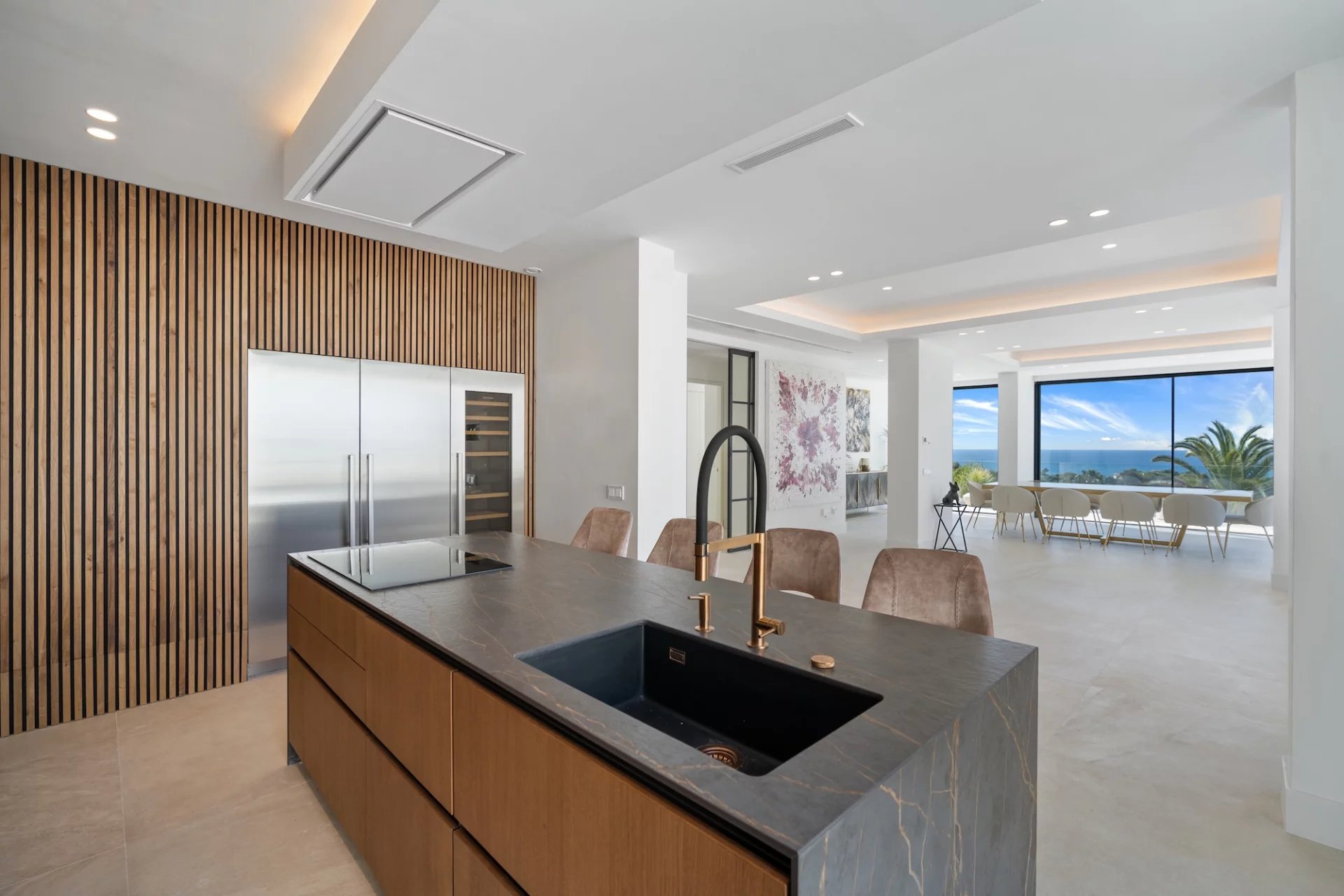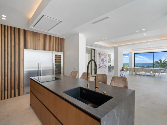 Au deuxième étage, vous serez accueillis par une cuisine ouverte moderne qui s’ouvre sur la salle à manger et le salon qui offrent une vue fantastique sur la mer ainsi que sur la piscine à débordement entourée d’une terrasse en bois.