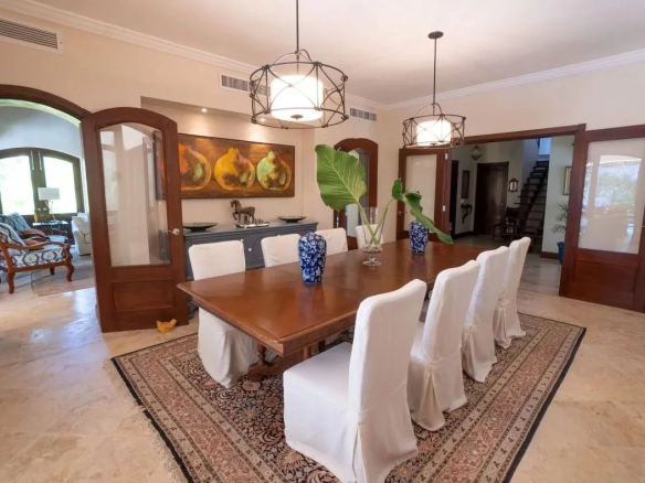 L’élégante villa de luxe est située dans un quartier prestigieux avec un service de sécurité 24h/24 et 7j/7, un centre équestre, un club de tennis, un restaurant club de plage et une piscine publique. La villa bénéficie d’intimité tout en offrant des vues captivantes et un accès facile aux commodités souhaitables.