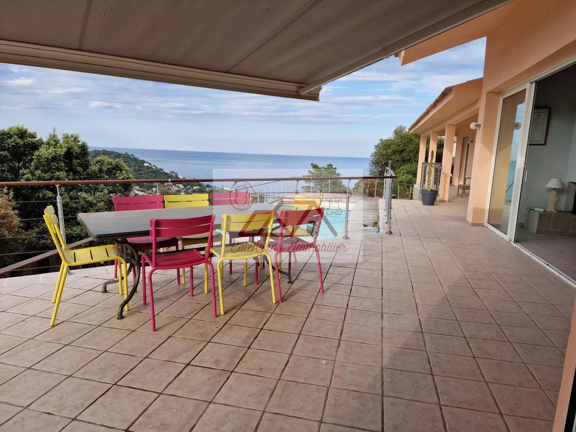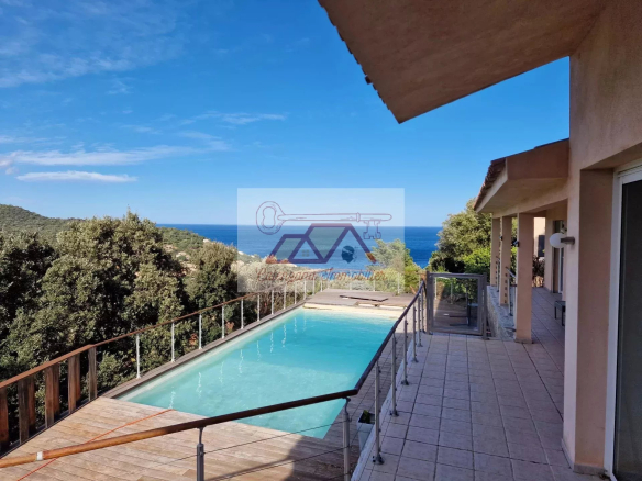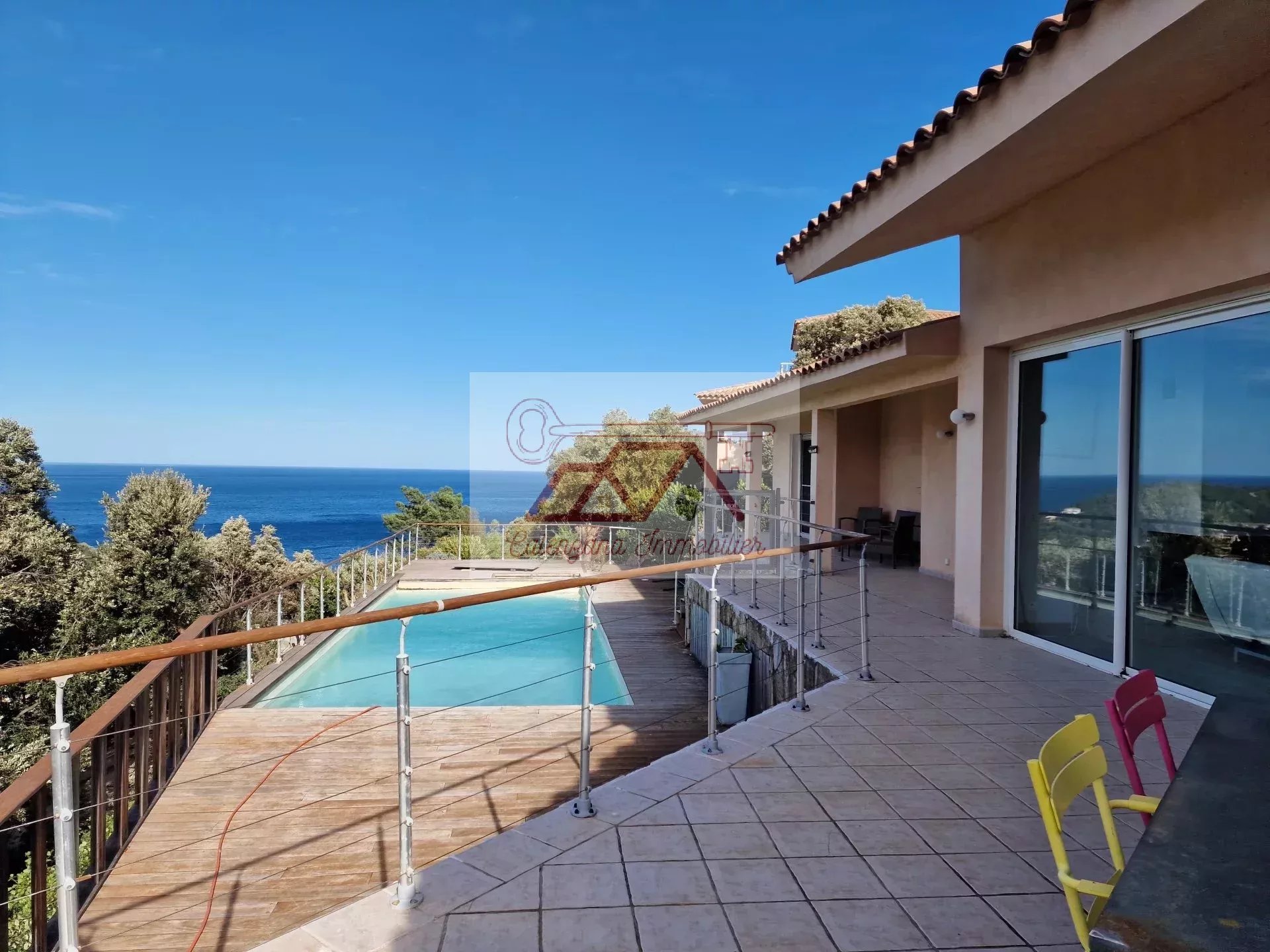 Vous profiterez d’une belle piscine entourée de bois, le tout offrant une vue imprenable sur la mer.