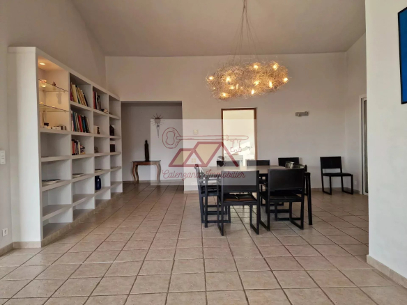 Elle se compose d’un très bel espace de vie traversant comprenant un grand salon avec une cheminée et des baies vitrées à galandage s’ouvrant sur la terrasse et piscine, une cuisine équipée et aménagée, une buanderie, cinq chambres ainsi que trois salles de bain/douche et trois wc.