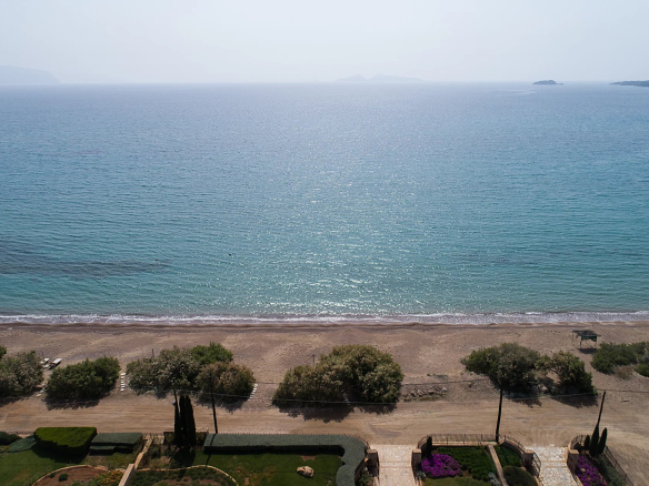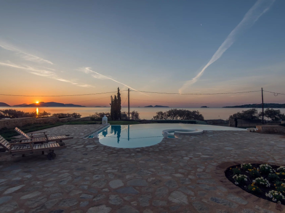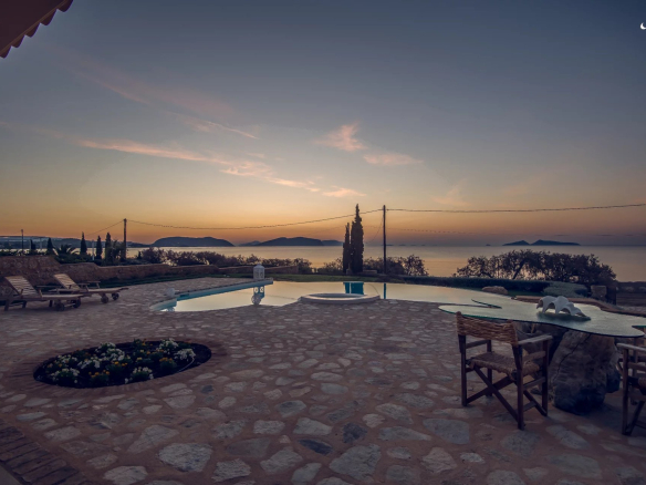 L’impressionnante Villa est située sur un terrain privilégié de 2 000 m² en face de la célèbre plage de sable de Petrothalassa, surplombant la mer et l’île pittoresque d’Hydra.